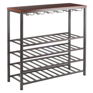 • The Winsome Wood Vinny 24-Bottle Wine Rack lets you store your favorite wine bottles as well as other spirits, a perfect addition to any home. A great piece for your dining or living room area. With space for 24 bottles of wine, you can have one or more of your favorite varieties on hand to serve during each meal or while entertaining family and guests. This rack has 6 slots to accommodate 0.75L wine bottles on each rack with a weight capacity of 25lbs per rack. There are six rows of glassware holders, allowing you to hang 18-24 wine glasses depending on the diameter. The top has a surface of 31.5in W x 16.22in D, great for displaying or can be used as a serving table. Constructed of solid wood to provide durability and sturdiness for long lasting durability. Finished in a rich espresso, this design can fit in with most styles of home decor. Conveniently ships in 1 box and ready for assembly. Replacement parts can be requested directly to the manufacturer within 60 days from date of purchase. UNIT DIMENSIONS: 31.5in W x 16.22in D x 35.67in H