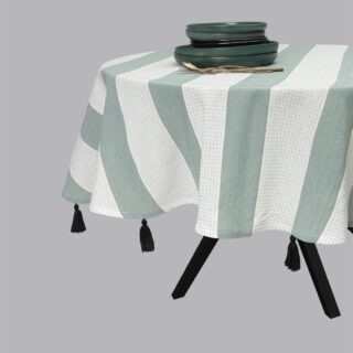 • The Thyme & Table Green and White with Black Tassels 70″ Round Tablecloth adds a stylish and functional touch to your dining experience. Crafted from high-quality fabric, this tablecloth is perfect for protecting your table while enhancing your decor. The round shape comfortably seats 4 people, making it ideal for smaller meals or intimate gatherings.