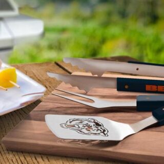 • Get your grill game on with an officially licensed set of barbecue tools. The barbecue tool set includes a Sportula, a pair of tongs and a grill fork. Each tool is made from heavy-duty stainless steel with brass-riveted team colored composite handles. Your team’s logo is stamped on the team colored composite handles and the team logo is laser cut through the blade of the Sportula. The Sportula and the fork both come with an integrated bottle opener. An unforgettable gift for any fan and the most noticed accessory at any tailgating event.