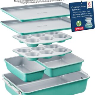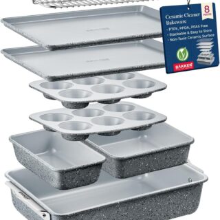 • Elevate your baking experience with our 8-Piece Stackable Bakeware Set, a versatile and health-conscious addition to your kitchen arsenal. Crafted from high-gauge aluminized steel, this set ensures even heat distribution, promoting consistent and delicious results in every baking endeavor. The bakeware features a durable ceramic non-stick coating guaranteeing a healthier cooking experience without compromising on performance. Designed for convenience and comfort, the bakeware is equipped with ergonomic polished stainless steel handles, providing a secure grip for easy handling. The strong riveted handles add durability, making these pieces a reliable and long-lasting choice for your kitchen. This comprehensive set includes essential bakeware pieces for various culinary creations, from two sheet pans and a muffin pan to a loaf pan, square cake pan, and a deep roaster with a handle. The proper sizing and compatibility with regular oven dimensions ensure versatility in your baking endeavors. Enjoy guilt-free baking with our non-toxic and non-allergic bakeware set, carefully designed to meet the highest health and safety standards. The stainless steel cooling rack adds a finishing touch, providing an ideal surface for cooling and presenting your culinary creations.With a body max temperature of 500F, this bakeware set opens up a world of baking possibilities. Whether you’re crafting cakes, muffins, roasts, or loaves, our stackable bakeware set is your go-to solution for achieving professional-quality results in the comfort of your own kitchen. Invest in the future of your culinary creations with our durable, convenient, and health-conscious bakeware set, designed to make every baking experience a delight.