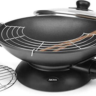 • Stir-fry in style with the Aroma 5Qt. Electric Wok, Black AEW-307; perfect for braising, tempura, steaming, and more. This sleek, cast metal wok has a nonstick coating, heats up quickly and retains heat for professional-tasting results every time. Includes all of the accessories you need to make all your favorite modern and traditional foods: long cooking chopsticks, a steam rack and a tempura rack. The large glass dome lid with adjustable steam vent allows for maximum cooking control. The entire unit easily detaches from the base and is dishwasher safe for easy cleanup and even easier storage.