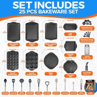 • The Emporio Kitchen 25-piece Nonstick Carbon Steel Bakeware Set is the perfect addition to any kitchen, whether for home cooks or professionals. This set includes one baking pan measuring 17.32” x 12.6” x 1.96”, one pizza pan measuring 14.56” x 12.99” x 0.78”, one small cookie pan measuring 15.15” 10.03” 0.60”, two round pans both measuring 10.24” x 9.60” x 1.60”, a square pan measuring 10.82 8.74 1.85, one loaf pan measuring 11.69 5.94 2.55, one big cookie pan measuring 17.1” x 11.8” x 0.67”, twelve-cup muffin pan measuring 16.22” x 10.43” x 1.18”, twenty-four-cup muffin pan measuring 16.92” x 10.62” x 0.98”, measuring spoons (1/4, 1/2, 1 tsp, 1 tbs), measuring cups (1/8, 1/4, 1/3, 1/2, and 1 cup), a whisk, tongs, silicone spatula, a large silicone brush, a medium silicone brush, a potato masher, one grater, a can opener, one solid spoon, one soup ladle, one slotted turner, a skimmer, one pasta server, and a recipe booklet. These pans are ideal for everything from baking cookies and croissants to roasting vegetables, ensuring even heat distribution thanks to their commercial-grade carbon steel construction. The sturdy design prevents warping, even at high temperatures, making them perfect for everyday use. The nonstick gray coating ensures that your baked goods slide right off and makes cleanup a breeze, helping you save time in the kitchen. These pans are oven-safe up to 450F, providing ample temperature resistance for a wide variety of recipes. In addition to their high performance, these pans feature a space-saving, stackable design that allows for easy storage, making them perfect for both home kitchens and professional settings. Safe for use in the oven, refrigerator, and freezer, this bakeware set provides a reliable solution for all your baking needs, ensuring that every meal is prepared safely.
