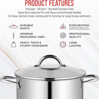 $40.14Add to cartCrafted with passion and precision, Bakken-Swiss brings to you a perfect distillation of excellence in cookware with our 20-Quart Stainless Steel Stockpot. From a small home kitchen of a culinary beginner to a seasoned commercial chef, this stockpot provides unmatched performance. Exquisite Design & Functionality: Our stockpot boasts a gorgeously polished silver aesthetic, inside and out. The ergonomic stainless steel handles ensure a comfortable grip for careful cooking, while the see-through glass lid allows for a peek at your grub without the need to uncover, retaining all the essential heat and delicious flavors. Superior Cooking Performance: Compatibility is key in cooking as it is in romance, and this pot understands that. Our stainless steel soup pot is designed to work on varied cooktops, providing budding chefs the freedom to shift between kitchens and cooking methods. The 18/0 non-reactive stainless steel interior ensures that your food will retain its natural flavor and nutrients, making it a great choice for health-conscious individuals. Durability Meets Precision: Durability is a hallmark of all Bakken-Swiss products. This stockpot, with its riveted handles and heavy-duty construction, is no exception. The detailed technical know-how in its construction, from its temperature resilience to the precise dimensions, is a testament to our commitment to quality. Cook a Variety of Dishes: From hearty stews and sumptuous soups to vibrant curries and enticing jambalayas, this stockpot is the perfect tool for a wide variety of different dishes. Treat it as the ultimate companion on any gastronomic journey. Inside every Bakken-Swiss box is a promise of performance, longevity, and utter culinary perfection never settle for anything less than the best.