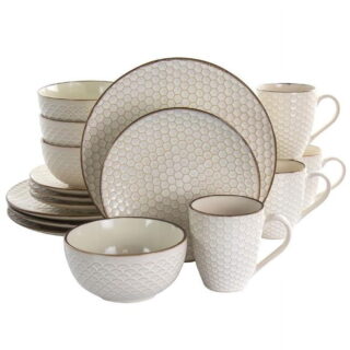 • Brighten up your table with this sweet 16 Piece Honey Ivory Stoneware Dinnerware Set by Elama. Beautifully textured tableware set is constructed of durable stoneware, ideal for every day and special occasion use. Classic honeycomb design combined with it’s brown trim will make your next meal stand out. Each plate is microwave and dishwasher safe making is easy for cleaning and reheating.