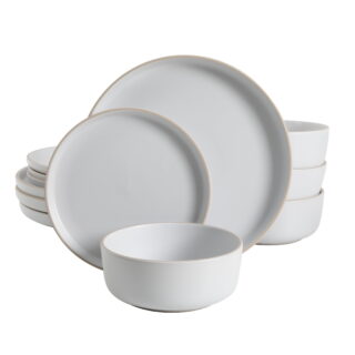 • Elevate your dining table and the special moments you spend there with the Gibson Home Everyday Essential 12-Piece Dinnerware Set. Made from durable stoneware and finished in a modern matte glaze, this dish set brings a sleek and sophisticated feel to any dining table. The rich white color accented with raw rim details will make your meals look cookbook-ready, and straight-sided shapes provide a contemporary twist to this classic dinnerware collection. Perfect for everyday use or for special occasions, this stylish Gibson dinnerware lends itself well to mix and match decor, creating opportunities to layer into eye-catching spreads on any table. Dishwasher and microwave safe for extra convenience and easy cleanup, these plates and bowls will add function and fashion to your kitchen and dining room. Includes place settings for four. This versatile plate set brings it all together to set the perfect stage for meaningful meals with family and friends. Add this set to your dinnerware collection and experience modern dining at home with the Gibson Home Everyday Essential 12-Piece Dinnerware Set.