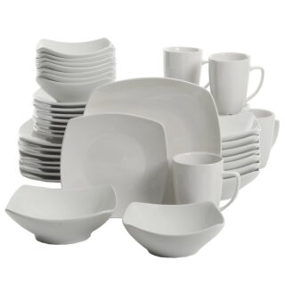• Gibson Home Everyday Square 40-Piece Dinnerware Set With contemporary soft square shapes, Gibson Home Everyday Square 40-Piece Dinnerware Set serves up functional fashion. Made from durable fine ceramic, this classic set of white dinnerware is versatile enough for everyday use while maintaining an understated elegance for entertaining. Place settings for eight include dinner plates, salad plates, bowls, prep bowls, and cups. Boasting a brilliant white glaze and clean lines, this set serves up style and practicality. Dishwasher and microwave safe, this dinnerware set is easy to clean and resists chipping and staining. Easy to pair with other decor, these pieces perform under pressure with a pinch of timeless charm. Enhance your tabletop and enjoy beautiful meals with the Gibson Home Everyday Square 40-Piece Dinnerware Set.