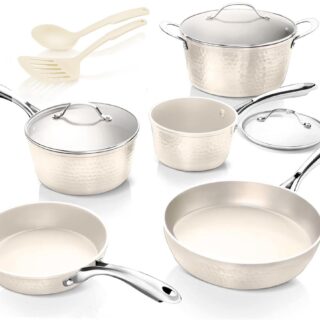 • Discover elegance and performance with the Gotham Steel Diamond Hammered Nonstick Pots and Pans 10 Piece Ceramic Kitchen Cookware Set in Cream. This stunning collection combines a timeless cream-tone hammered finish with advanced cooking technology, making it the ideal choice for the modern home chef. Engineered with a 2x better nonstick release than traditional Gotham Steel cookware, the ultra-durable, diamond-infused ceramic coating ensures effortless food release and quick cleanup. Crafted from premium aluminum with titanium enhancements, the cookware guarantees even heat distribution and scratch resistance, ensuring long-lasting performance. Designed for versatility, the set is compatible with all stovetops, including induction, and is oven safe up to 500F. From stovetop searing to oven baking, this set offers the adaptability to handle every recipe. Elevate your culinary creations while adding a touch of sophistication to your kitchen with this stylish and functional cookware set.