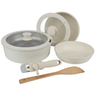 • Cook up a variety of dishes with the 8-Piece Pots and Pans Set Non Stick by Home-Complete. These pots and pans are made of durable aluminum alloy with a ceramic coating, making them nonstick, dishwasher safe, and long-lasting. This kitchen set comes with a 1.48qt saut pan, a large 4.44qt sauce pan, a smaller 2.96qt sauce pan, two lids, a removable handle, a wooden spoon, and a metal steam basket for a complete cooking set perfect for new homeowners, first time renters, and college students. Please note, this cookware set is not oven safe.