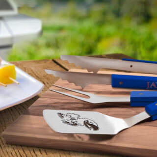$44.99Add to cartGet your grill game on with an officially licensed set of barbecue tools. The barbecue tool set includes a Sportula, a pair of tongs and a grill fork. Each tool is made from heavy-duty stainless steel with brass-riveted team colored composite handles. Your team’s logo is stamped on the team colored composite handles and the team logo is laser cut through the blade of the Sportula. The Sportula and the fork both come with an integrated bottle opener. An unforgettable gift for any fan and the most noticed accessory at any tailgating event.