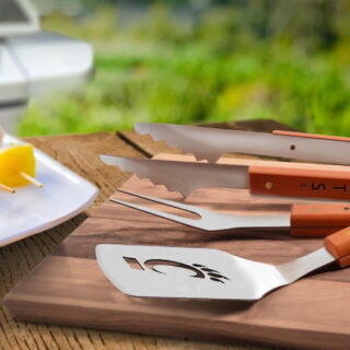 • Get your grill game on with an officially licensed set of barbecue tools. The barbecue tool set includes a Sportula, a pair of tongs and a grill fork. Each tool is made from heavy-duty stainless steel with brass-riveted hard maple handles. The logo is stamped on the hard maple handles and the logo is laser cut through the blade of the Sportula. The Sportula and the fork both come with an integrated bottle opener. An unforgettable gift for any fan and the most noticed accessory at any tailgating event.