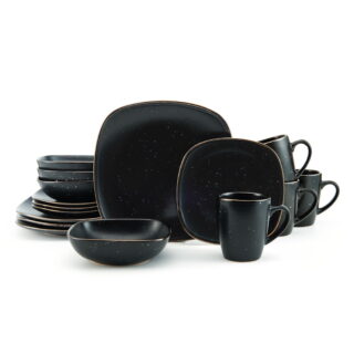 $36.49Add to cartGive your tabletop display a modern makeover with this Decker Black 16-Piece Dinnerware Set by Pfaltzgraff. Crafted of high-quality stoneware, this contemporary collection features square-shaped pieces with gently curved corners. The deep black bodies are adorned with a mesmerizing speckle effect, and highlighted with metallic rims. 16-piece set, service for 4, includes 4 each of: 10-inch dinner plate, 7-3/4 inch salad plate, 20-fluid ounce bowl measuring 1-3/4 inches tall with a 6-1/2 inch diameter, and 13-fluid ounce mug measuring 4-1/4 inches tall. Microwave and dishwasher safe.