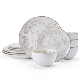 • Enliven your tabletop with the floral elegance of this Pfaltzgraff 12-Piece Enchanted Bloom Dinnerware Set. Beautifully crafted of high-quality stoneware for strength and durability, this captivating collection features a bold, botanical-inspired pattern that brings a touch of garden charm to mealtime. The eye-catching, gray flower and rim design makes a striking statement on a contemporary tabletop and is perfect for everyday dining or casual entertaining. 12-piece set, service for 4, includes 4 each of: 10-1/4 inch dinner plate, 8-inch salad plate, and 3-1/4 inch high by 5-1/2 inch diameter all-purpose bowl with a 22-fluid ounce capacity. Microwave and dishwasher safe.