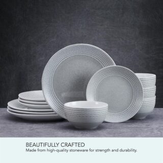 • This Felicity 12-Piece Dinnerware Set by Pfaltzgraff defies expectations using a unique wax-resistant technique to form a sophisticated dot pattern along the rim of the dinnerware, creating a sense of depth and dimension on your table. Made from high-quality stoneware for strength and durability, the collection has a gray, reactive glaze finish that brings a contemporary element to everyday dining or casual gatherings. 12-piece set, service for 4, includes 4 each of: 10 1-/2 inch dinner plate, 7-1/2 inch salad plate, and 5-1/2 inch wide, 3 inch tall (19 ounce) all-purpose bowl. Microwave and dishwasher safe.