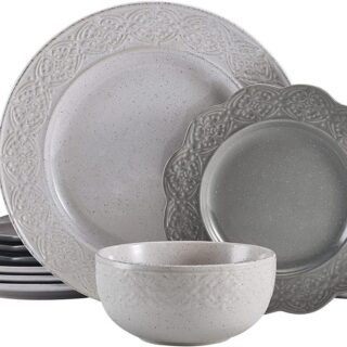 • Make an impression every time you set the table with this Emma 12-Piece Dinnerware Set by Pfaltzgraff. Made from high-quality stoneware for strength and durability, this collection is bold and trendy with embossed rims highlighted by a metallic edge detail. The neutral gray color complements any stemware or flatware and is perfect for everyday dining or for adding a touch of sophistication to casual gatherings. 12-piece set, service for 4, includes 4 each of: 10 1-/2 inch dinner plate, 8-1/4 inch salad plate, and 5-1/2 inch all-purpose bowl with a 21-fluid ounce capacity. Microwave and dishwasher safe.