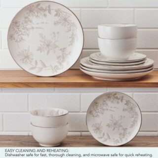 • Enliven your tabletop with the floral elegance of this Pfaltzgraff 12-Piece Enchanted Bloom Dinnerware Set. Beautifully crafted of high-quality stoneware for strength and durability, this captivating collection features a bold, botanical-inspired pattern that brings a touch of garden charm to mealtime. The eye-catching, gray flower and rim design makes a striking statement on a contemporary tabletop and is perfect for everyday dining or casual entertaining. 12-piece set, service for 4, includes 4 each of: 10-1/4 inch dinner plate, 8-inch salad plate, and 3-1/4 inch high by 5-1/2 inch diameter all-purpose bowl with a 22-fluid ounce capacity. Microwave and dishwasher safe.