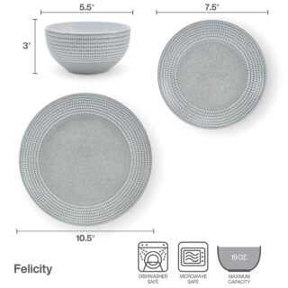 • This Felicity 12-Piece Dinnerware Set by Pfaltzgraff defies expectations using a unique wax-resistant technique to form a sophisticated dot pattern along the rim of the dinnerware, creating a sense of depth and dimension on your table. Made from high-quality stoneware for strength and durability, the collection has a gray, reactive glaze finish that brings a contemporary element to everyday dining or casual gatherings. 12-piece set, service for 4, includes 4 each of: 10 1-/2 inch dinner plate, 7-1/2 inch salad plate, and 5-1/2 inch wide, 3 inch tall (19 ounce) all-purpose bowl. Microwave and dishwasher safe.