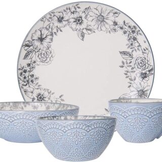 • Bold and contemporary this Pfaltzgraff 12-Piece Hayden Blue Dinnerware Set ensures you always have the basics on hand for everyday dining. Made of high-quality stoneware for strength and durability in contemporary coupe shapes, each piece is adorned with a blue floral border that beautifully enhances the cream color of the interior and brings modern appeal to your casual tabletop display. 12-piece set, service for 4, includes 4 each of: 11-inch dinner plate, 32-fluid ounce pasta bowl measuring 2-1/3 inches tall with an 8-inch diameter, and 24-fluid ounce all-purpose bowl measuring 2-1/2 inches tall with a 6-1/3 inch diameter. Microwave and dishwasher safe.