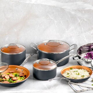 • Experience the epitome of culinary versatility with the Gotham Steel Nonstick Pots and Pans 10 Piece Kitchen Cookware Set, meticulously designed to cater to every aspect of your cooking needs. This collection features a fusion of high-performance aluminum pots, pans, and skillets, all unified by a stunning gray exterior with a rich bronze-tone interior. Each piece is fortified with a diamond-infused, triple-layer nonstick ceramic coating, ensuring a superior cooking experience that allows for healthy, oil-free meals with unbeatable food release. Crafted for durability and ease, the robust construction of each pot and pan is enhanced with titanium reinforcement, making them ultra-durable and scratch-resistant against even the toughest kitchen utensils. The lightweight aluminum build ensures rapid and even heat distribution, eliminating hot spots and ensuring your meals cook perfectly every time. Stainless steel handles are ergonomically designed to provide a secure and comfortable grip. Whether searing steaks, simmering sauces, or sauting vegetables, this set is designed to perform. The versatility extends from the stovetop, where these pieces shine on gas, electric, and glass cooktops, to the oven, where they are safe up to 500F. After cooking, cleanup is a breeze with each component’s dishwasher-safe design, making this set as convenient as it is functional. Elevate your kitchen’s functionality and style with this all-in-one set that not only promises exceptional performance and longevity but also enhances your dcor with its elegant aesthetics.
