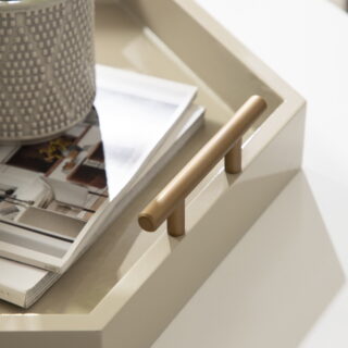 $39.51Add to cartBring modern glam style into your home with this hexagon-shaped decorative accent tray. The Lipton tray is perfect for showcasing mid-century modern style with its glossy sand finish and unique shape. Place this charming tray on your entrance console table as a trinket tray to hold your keys and mail, as a serving tray for your next fancy get-together, or as a makeup tray next to your vanity. This tray can also be used as a decorative accent on an ottoman to hold your media remotes or on a console as a decorative surface for plants, photos, and other family keepsakes. Constructed of lightweight material with a glossy finish and metal handles, this tray is sturdy yet refined, giving your home a beautiful mid-century theme with a practical design. The tray measures 18 inches wide, 18 inches deep, and stands 3.25 inches high, giving you plenty of room for various purposes. The Lipton allows you to bring a chic and glamorous decorative accent into your home that helps you layer your decor and provides you with another functional space to play with.