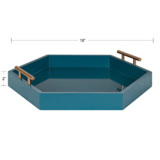 $43.89Add to cartBring modern glam style into your home with this hexagon-shaped decorative accent tray. The Lipton tray is perfect for showcasing mid-century modern style with its glossy teal finish and unique shape. Place this charming tray on your entrance console table as a trinket tray to hold your keys and mail, as a serving tray for your next fancy get-together, or as a makeup tray next to your vanity. This tray can also be used as a decorative accent on an ottoman to hold your media remotes or on a console as a decorative surface for plants, photos, and other family keepsakes. Constructed of lightweight material with a glossy finish and metal handles, this tray is sturdy yet refined, giving your home a beautiful mid-century theme with a practical design. The tray measures 18 inches wide, 18 inches deep, and stands 3.25 inches high, giving you plenty of room for various purposes. The Lipton allows you to bring a chic and glamorous decorative accent into your home that helps you layer your decor and provides you with another functional space to play with.