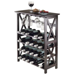$33.17Add to cartThe Winsome Wood Vinny 24-Bottle Wine Rack lets you store your favorite wine bottles as well as other spirits, a perfect addition to any home. A great piece for your dining or living room area. With space for 24 bottles of wine, you can have one or more of your favorite varieties on hand to serve during each meal or while entertaining family and guests. This rack has 6 slots to accommodate 0.75L wine bottles on each rack with a weight capacity of 25lbs per rack. There are six rows of glassware holders, allowing you to hang 18-24 wine glasses depending on the diameter. The top has a surface of 31.5in W x 16.22in D, great for displaying or can be used as a serving table. Constructed of solid wood to provide durability and sturdiness for long lasting durability. Finished in a rich espresso, this design can fit in with most styles of home decor. Conveniently ships in 1 box and ready for assembly. Replacement parts can be requested directly to the manufacturer within 60 days from date of purchase. UNIT DIMENSIONS: 31.5in W x 16.22in D x 35.67in H