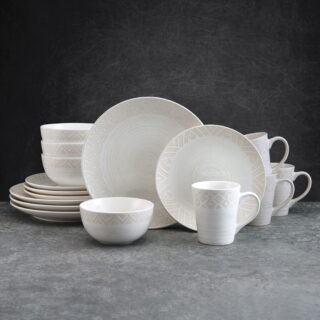 $53.18Add to cartThis Vera 16-Piece Dinnerware Set fuses classic elegance with modern sophistication. Crafted of high-quality stoneware, each cream color piece has a rustic spiraling design bordered by a thick band adorned with an eye-catching geometric pattern. This collection is a perfect way to bring contemporary style to your dinner gatherings. 16-piece set, service for 4, includes 4 each of: 10-1/2 inch dinner plate, 8-1/4 inch salad plate, 21-ounce bowl measuring 2-3/4 inches tall with a 5-1/2 inch diameter, and 12-fluid ounce mug measuring 4-1/4 inches tall. Microwave and dishwasher safe.