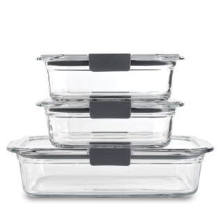 $37.78Add to cartRubbermaid Brilliance Glass Food Storage Containers are intelligently crafted, and beautifully designed. These glass containers have clear plastic lids with a 100% airtight, leak-proof seal and secure latches to make reheating and storing easy. Built-in vents under the latches allow steam to escape so you can microwave food splatter-free, without removing the lid. Crystal-clear lids and bases make it easy to see whats stored inside. The lids are made with StainShield plastic so they’re stain and odor resistant, helping them stay looking like new. These food storage containers are space saving, with a modular design for perfect organization and stacking in your fridge or cabinet. The universal lids fit across all Rubbermaid Brilliance containers, regardless of material type. These Rubbermaid containers are BPA-free, microwave-safe, dishwasher-safe, and freezer-safe. The glass container bases are also oven safe up to 450 degrees F.