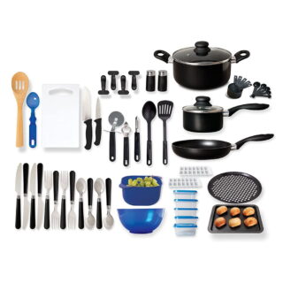 $64.01Add to cartThe total kitchen 59-piece combo set celebrates comfort and contemporary style. This complete set features every kitchen essentials you will ever need. Every piece of this set is made with high-quality material that will withstand time and wear. Ideal for dorm rooms, first apartments, and RV’s. Cookware and bakeware are dishwasher safe.