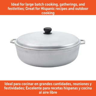 $74.30Add to cartThe IMUSA 27Qt Basic Caldero is an essential piece in every Hispanic kitchen, renowned for its durability and unique design. This caldero is manufactured in Colombia and is made of cast aluminum with a natural finish cooking surface that seasons over time. This IMUSA cookware piece has a capacity of 27Qt. The IMUSA Basic Caldero includes its tight-fitting lid, steam vent for moisture control, and a convenient knob and side handles for safe operation. The thick walls will deliver consistent and delicious results each time. With this versatile piece, you can cook a variety of different meals. Whether creating gourmet dishes, cooking rice, simmering beans, braising meats, preparing stews, crafting sauces, or enjoying comfort foods, the IMUSA Basic Caldero excels. The IMUSA Basic Caldero is oven-safe without the lid, making it perfect for grilling and baking. After cooking, take this caldero straight from the kitchen to the table as a stylish serving dish. Trust the IMUSA Basic Caldero for balanced, home-cooked meals. It will surely become your kitchen’s beloved companion, uniting tradition, and innovation in every delectable creation. Elevate your culinary experience with this enduring symbol of Hispanic heritage.