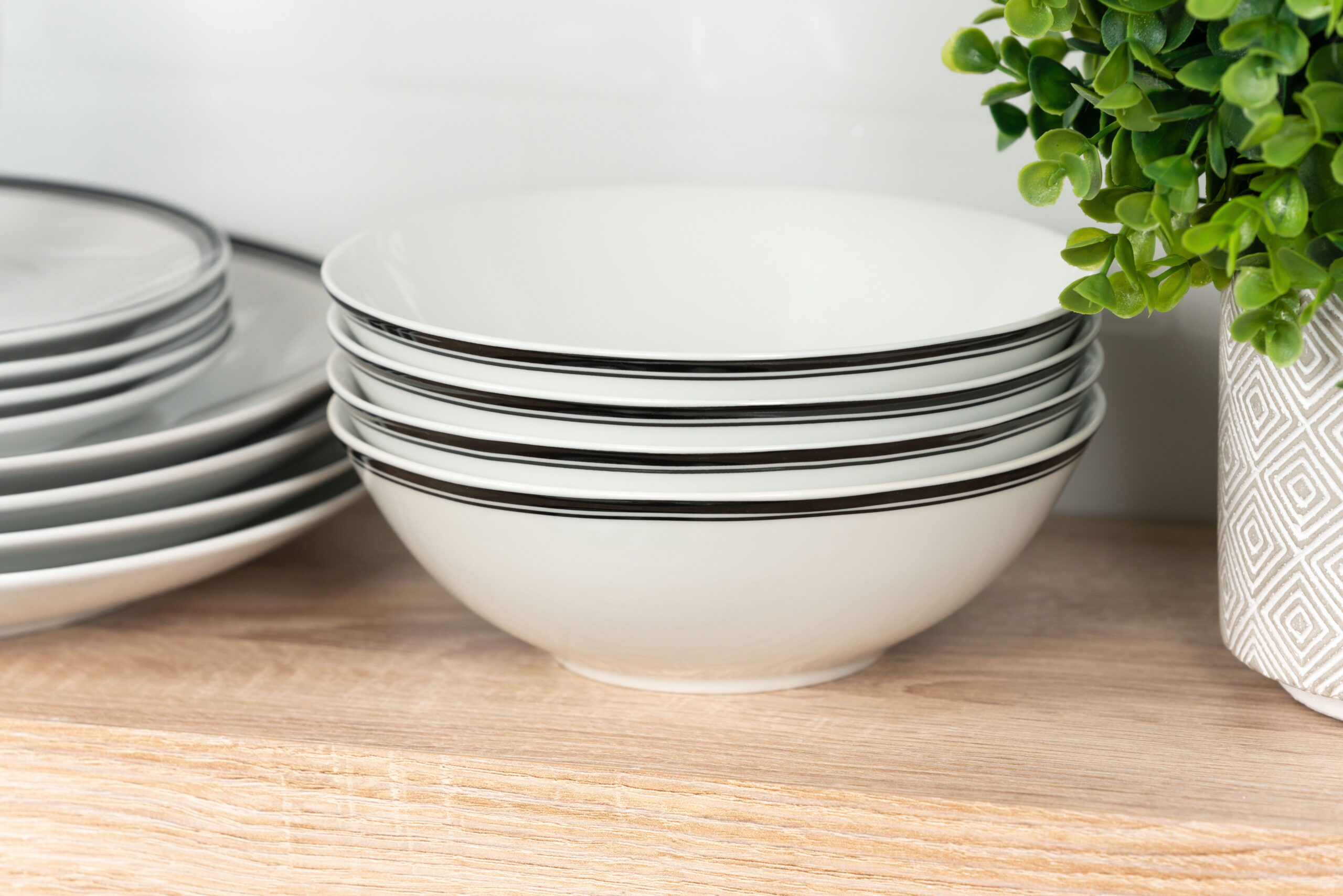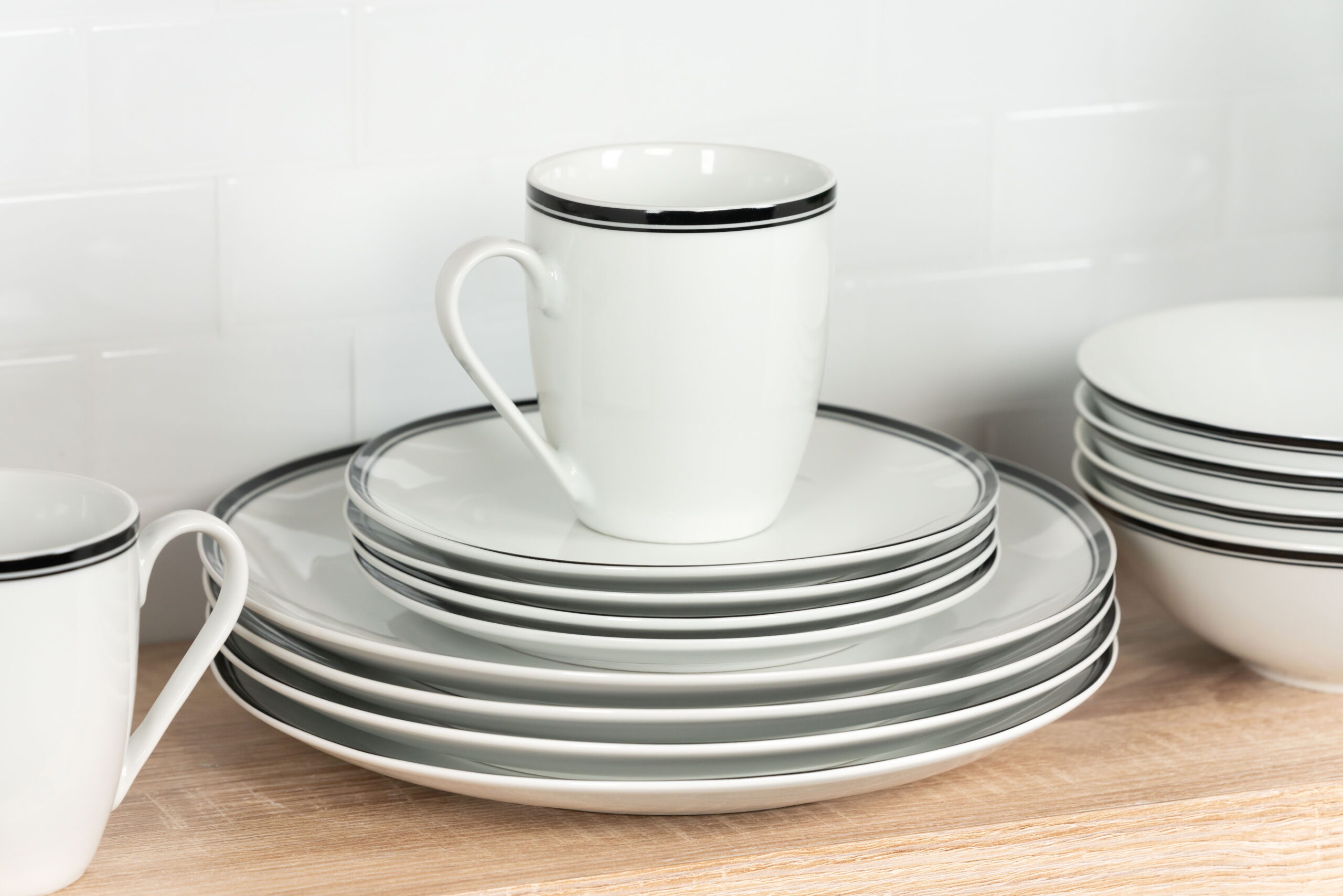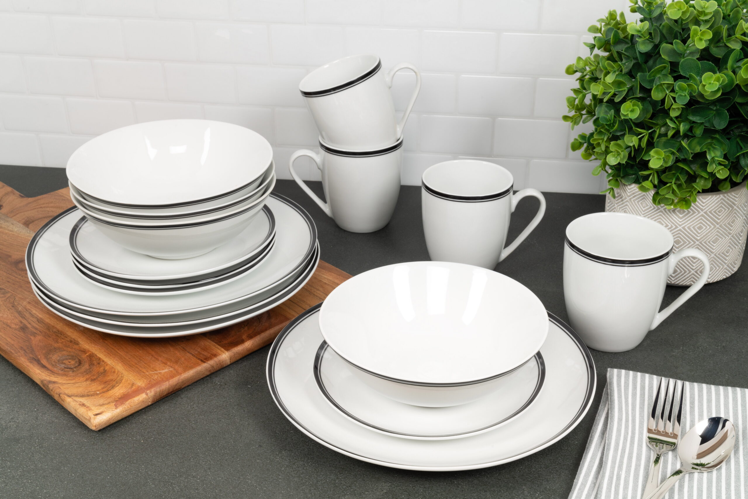 Classic, clean, and durable, the Simply Coupe collection sports a seamless shape and a double banded rim decal in a variety of stylish shades. Made with oven-to-table, microwave, and dishwasher safe porcelain these dishes will be your go-to for breakfast, lunch, dinner, and snacks in between. This 10 Strawberry Street Black 16-Piece Dinnerware Set serves four and includes: 4 dinner plates, 4 salad plates, 4 soup bowls and 4 mugs.