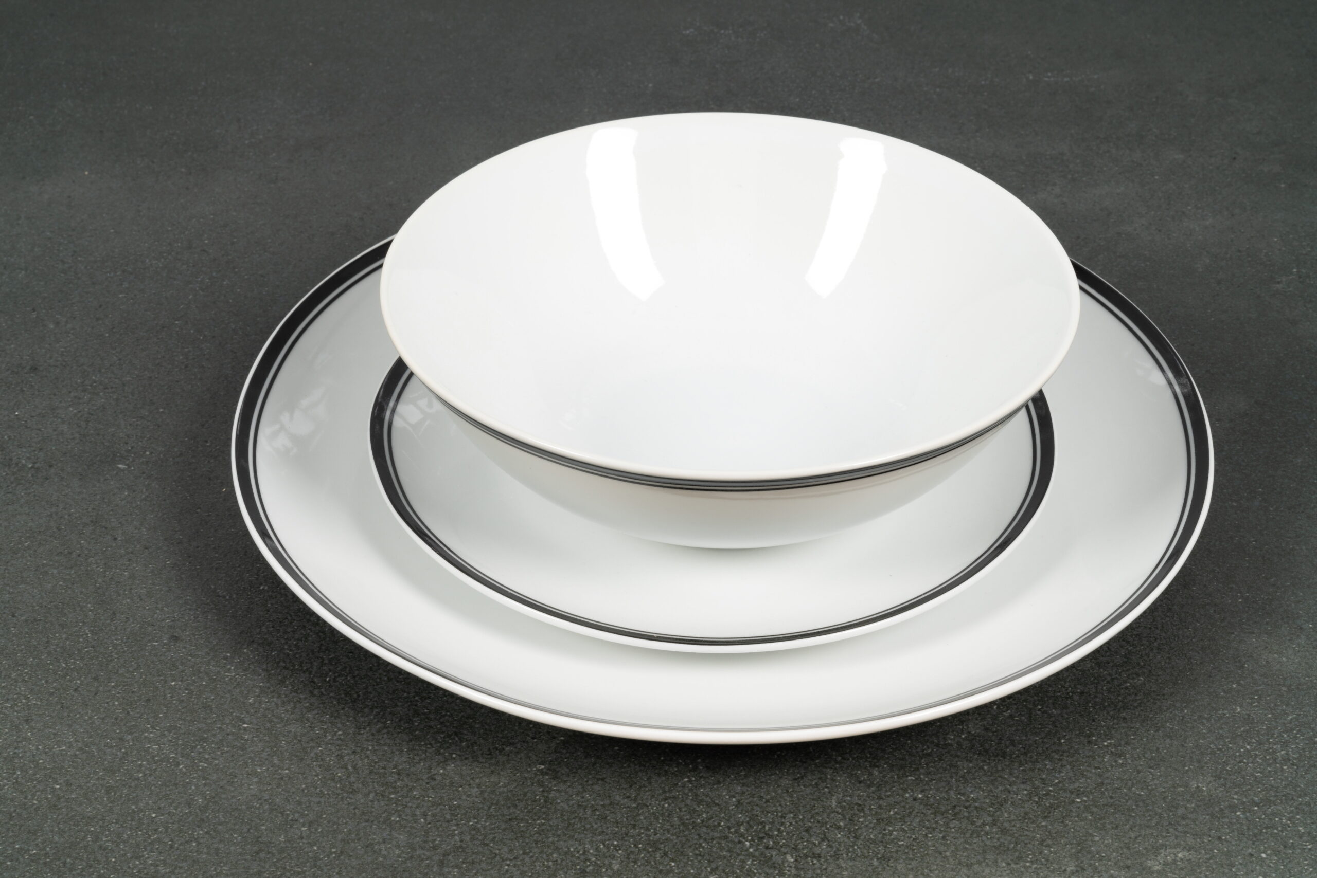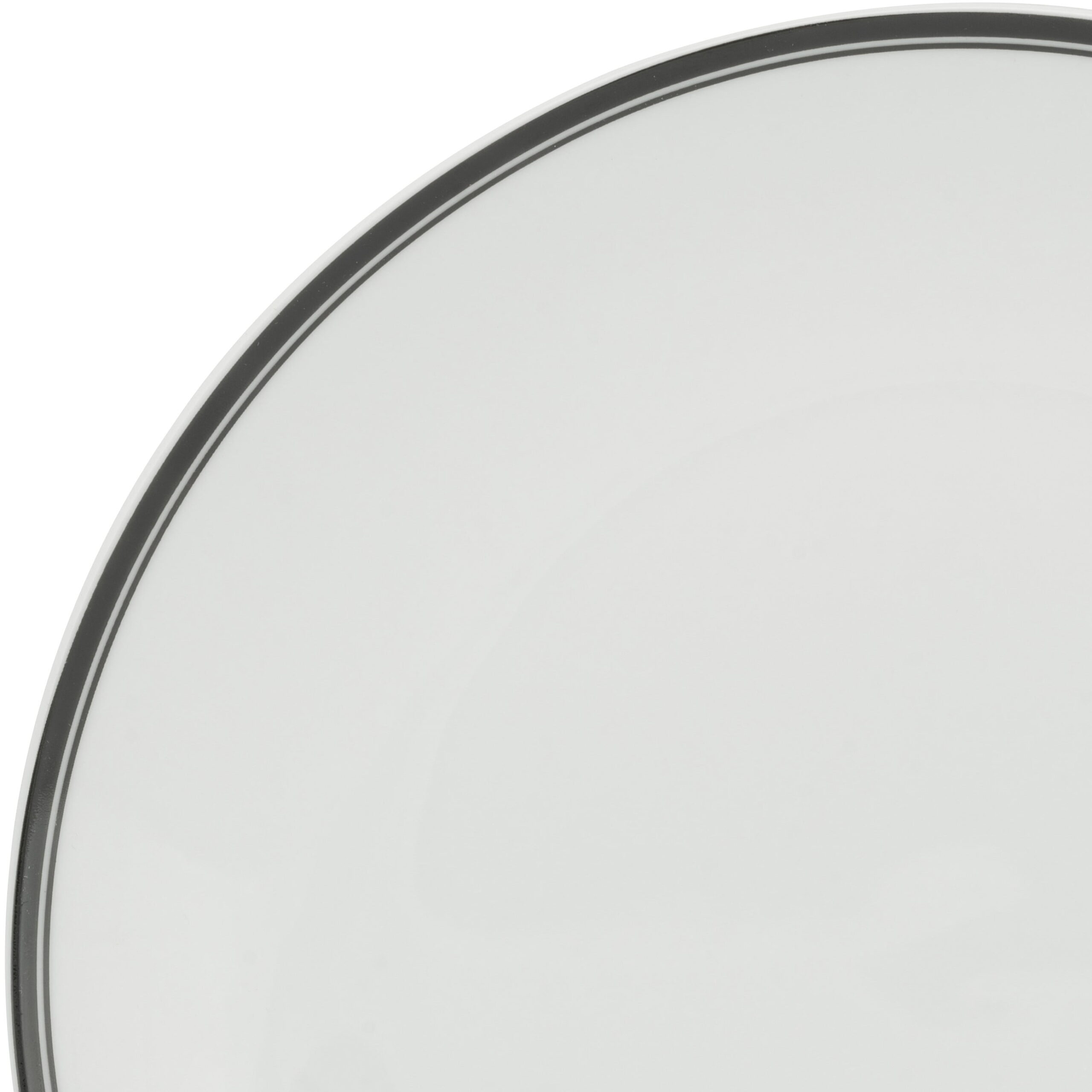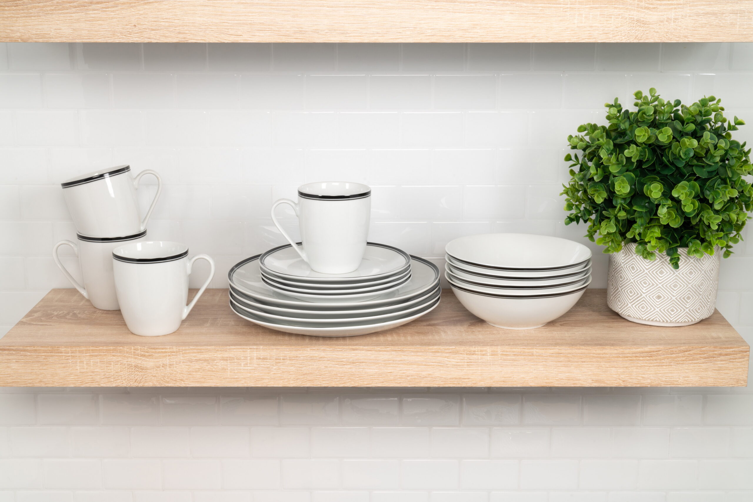 Classic, clean, and durable, the Simply Coupe collection sports a seamless shape and a double banded rim decal in a variety of stylish shades. Made with oven-to-table, microwave, and dishwasher safe porcelain these dishes will be your go-to for breakfast, lunch, dinner, and snacks in between. This 10 Strawberry Street Black 16-Piece Dinnerware Set serves four and includes: 4 dinner plates, 4 salad plates, 4 soup bowls and 4 mugs.