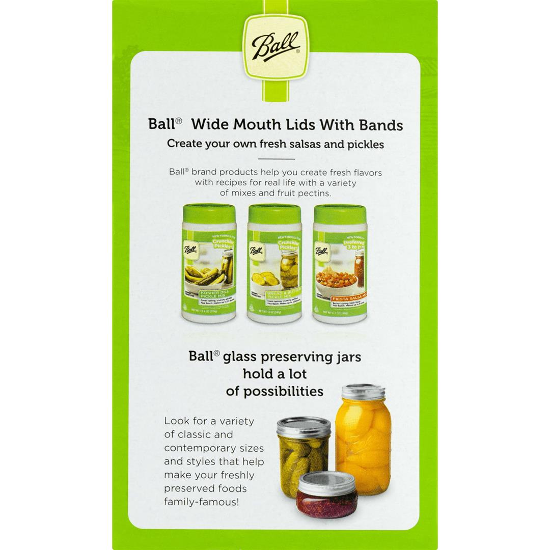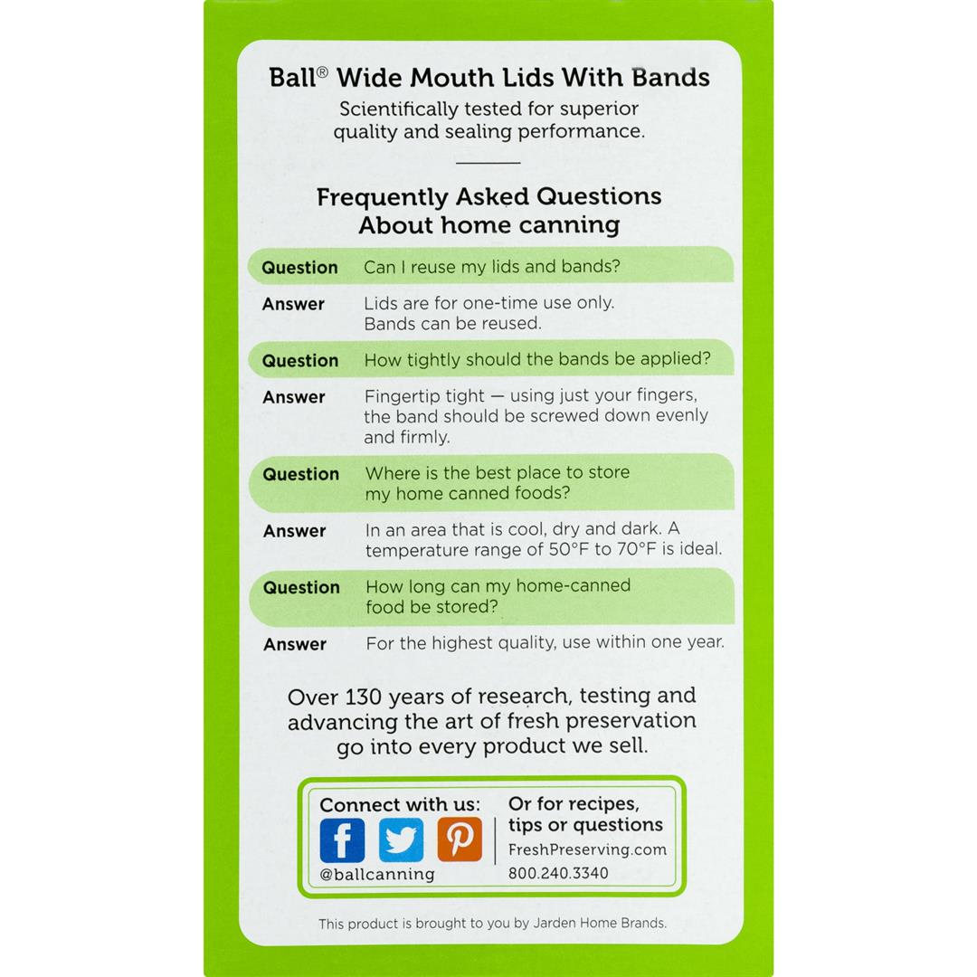 Ball Wide Mouth Lids and Bands for preserving fit all wide mouth glass preserving jars. Seal in freshness and enjoy freshly made foods anytime. Lids are for one-time use only; bands can be reused. Wide Mouth Mason jar lids & bands create an airtight seal to keep food preserved When canning, lid sealing material functionality is single-use only Quality craftsmanship trusted by generations of canners Includes 12 Mason jar lids and matching bands BPA-free