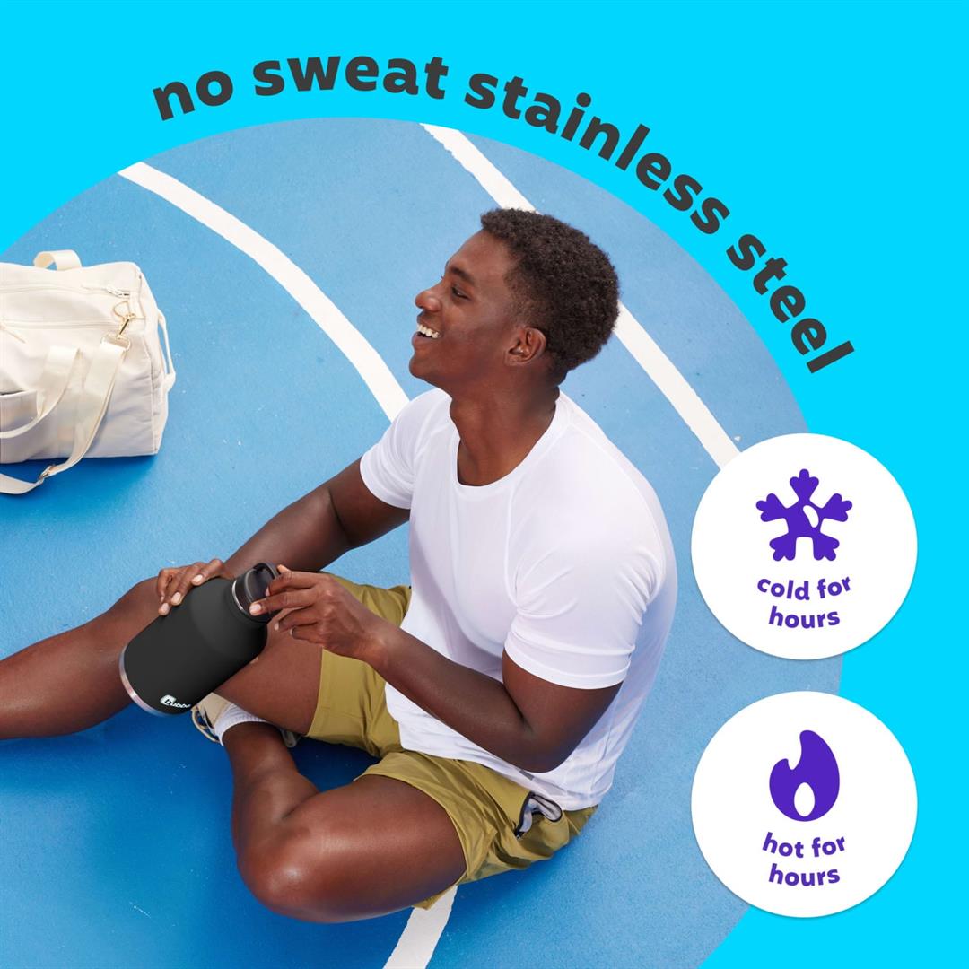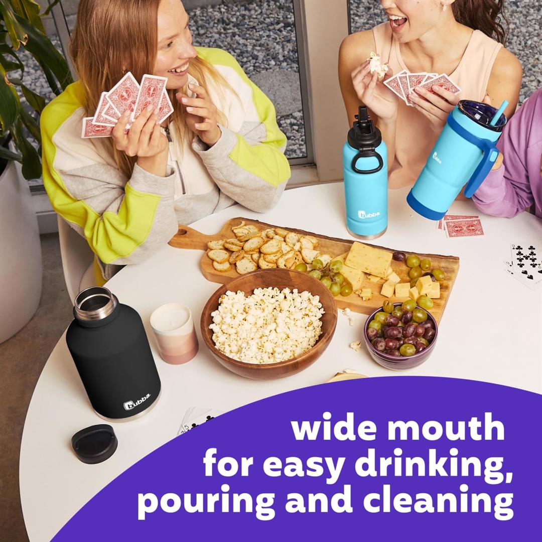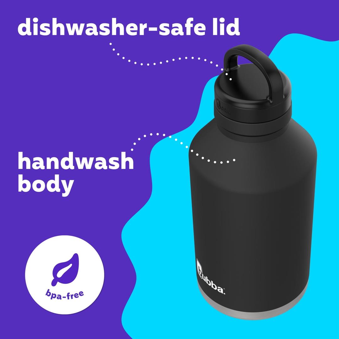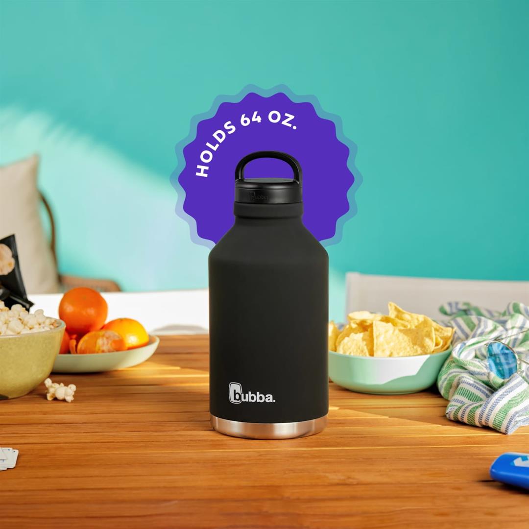 bubba Growler Stainless Steel Water Bottle Wide Mouth Rubberized Licorice, 64 fl oz. Dual-wall vacuum-insulated stainless steel growler keeps drinks cold up to 80 hours without sweating or hot up to 26 hours Wide-mouth opening lets the drinks flow freely for a comfortable drinking experience; lid is leak-proof when closed and can be unscrewed to add ice large cubes and to clean thoroughly Sturdy carrying handle makes bringing a growler of your favorite brew to any social gathering more convenient 100% BPA-free construction for added peace of mind; guaranteed for life Guaranteed for life* Guaranteed for life. *Limited warranty only applicable in US & Canada