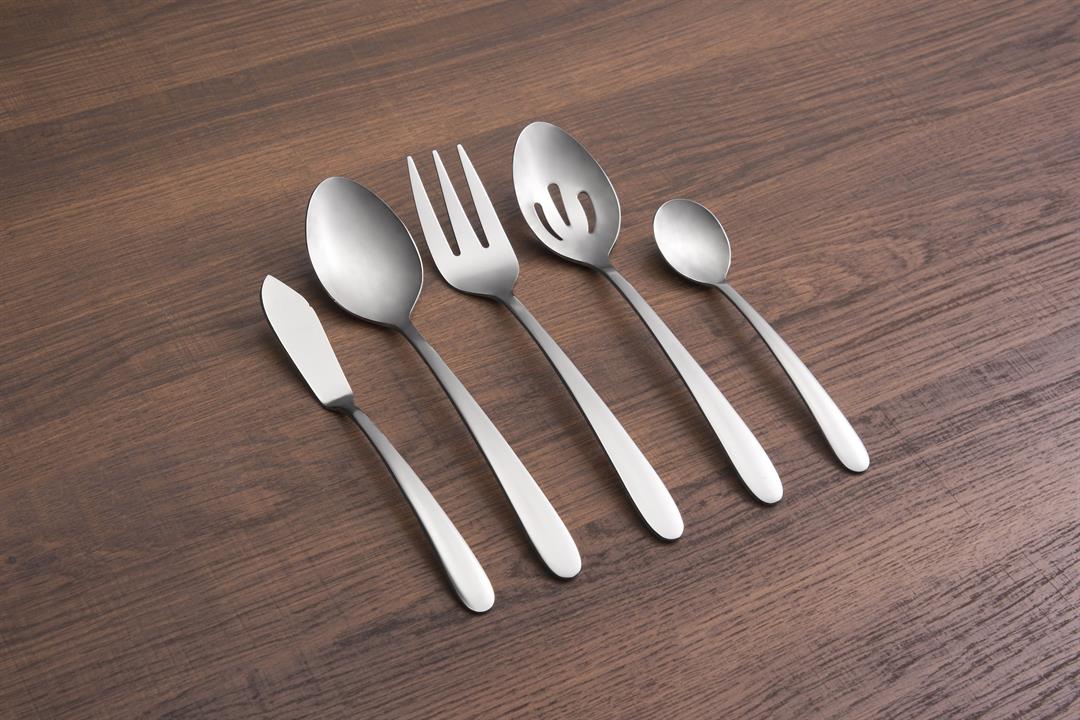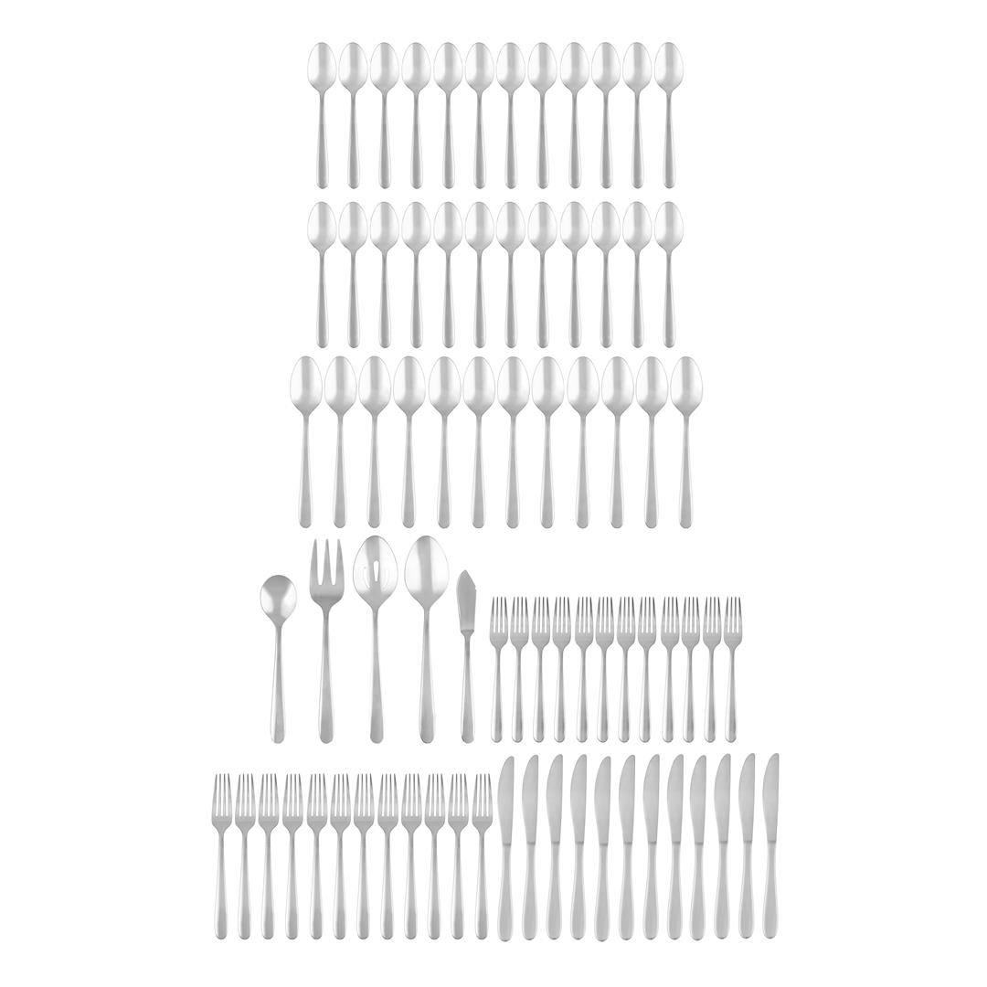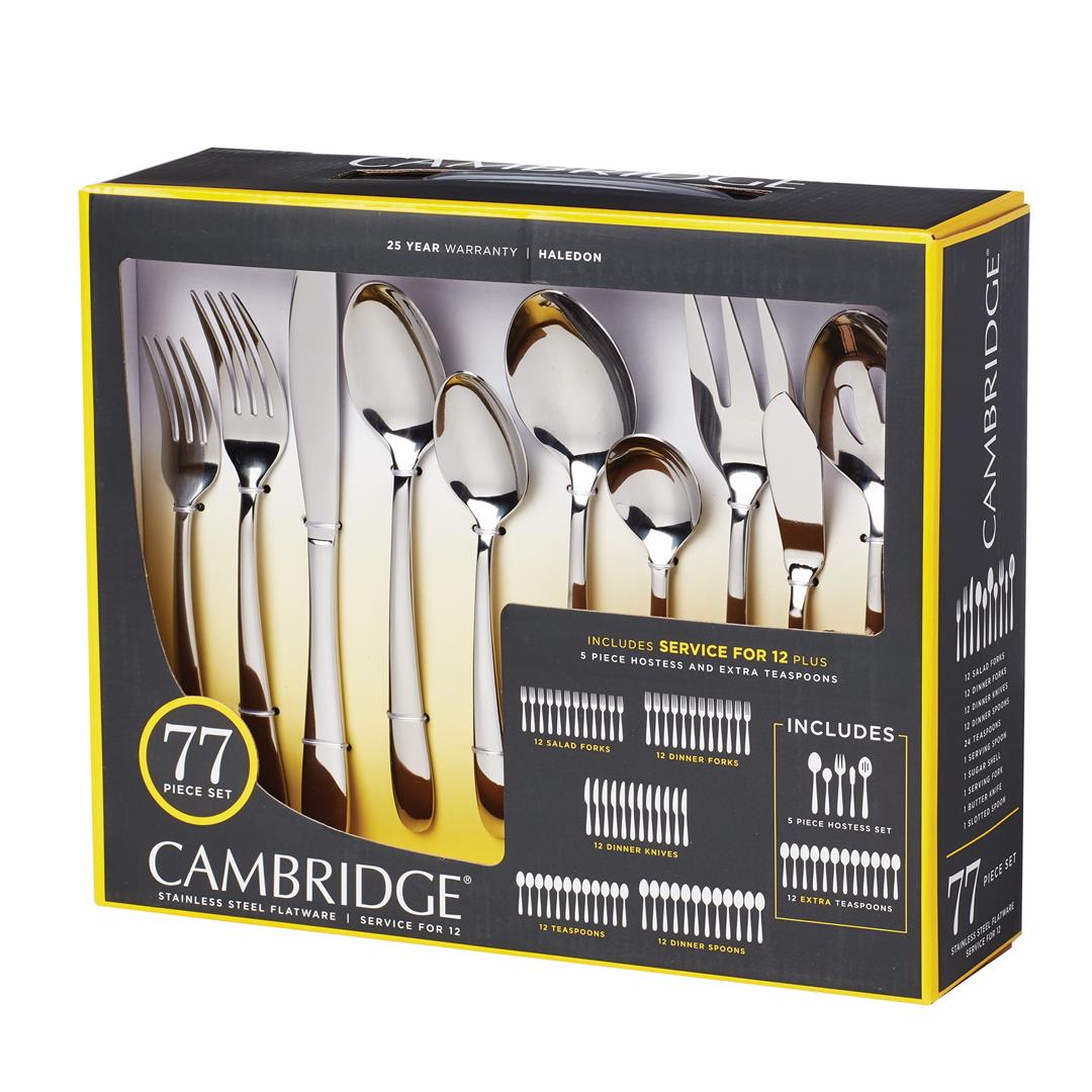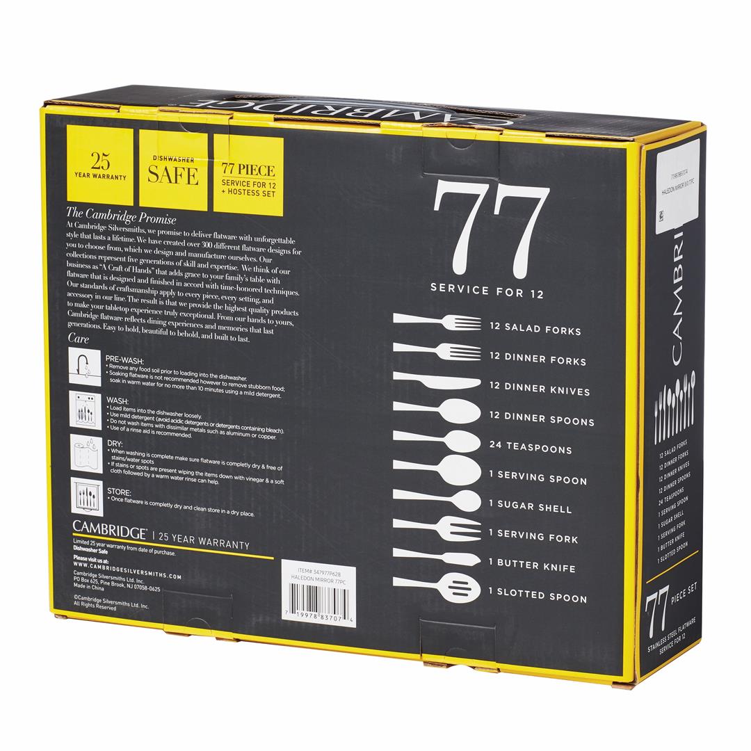 Cambridge Haledon Mirror 77-Piece Stainless Steel Flatware Set (Service for 12) Includes: 24 teaspoons, 12 salad forks, 12 dinner forks, 12 dinner knives, 12 dinner spoons, and a 5-piece serve set Stainless steel construction Dishwasher safe