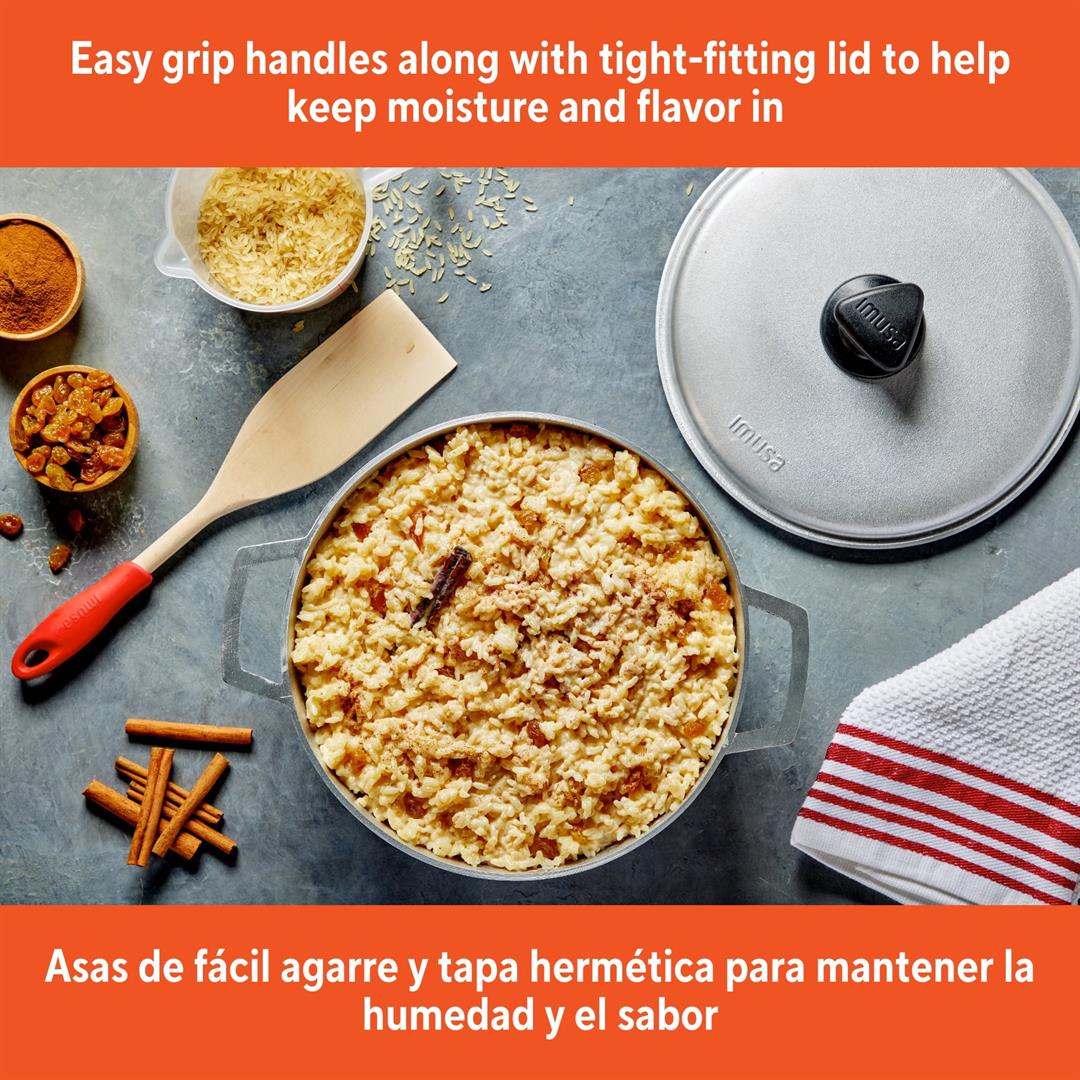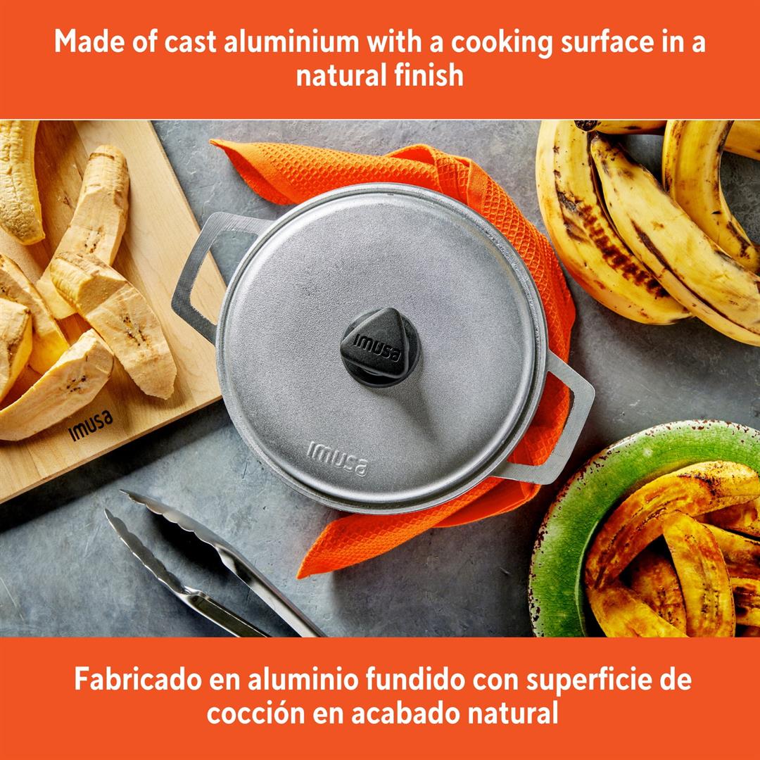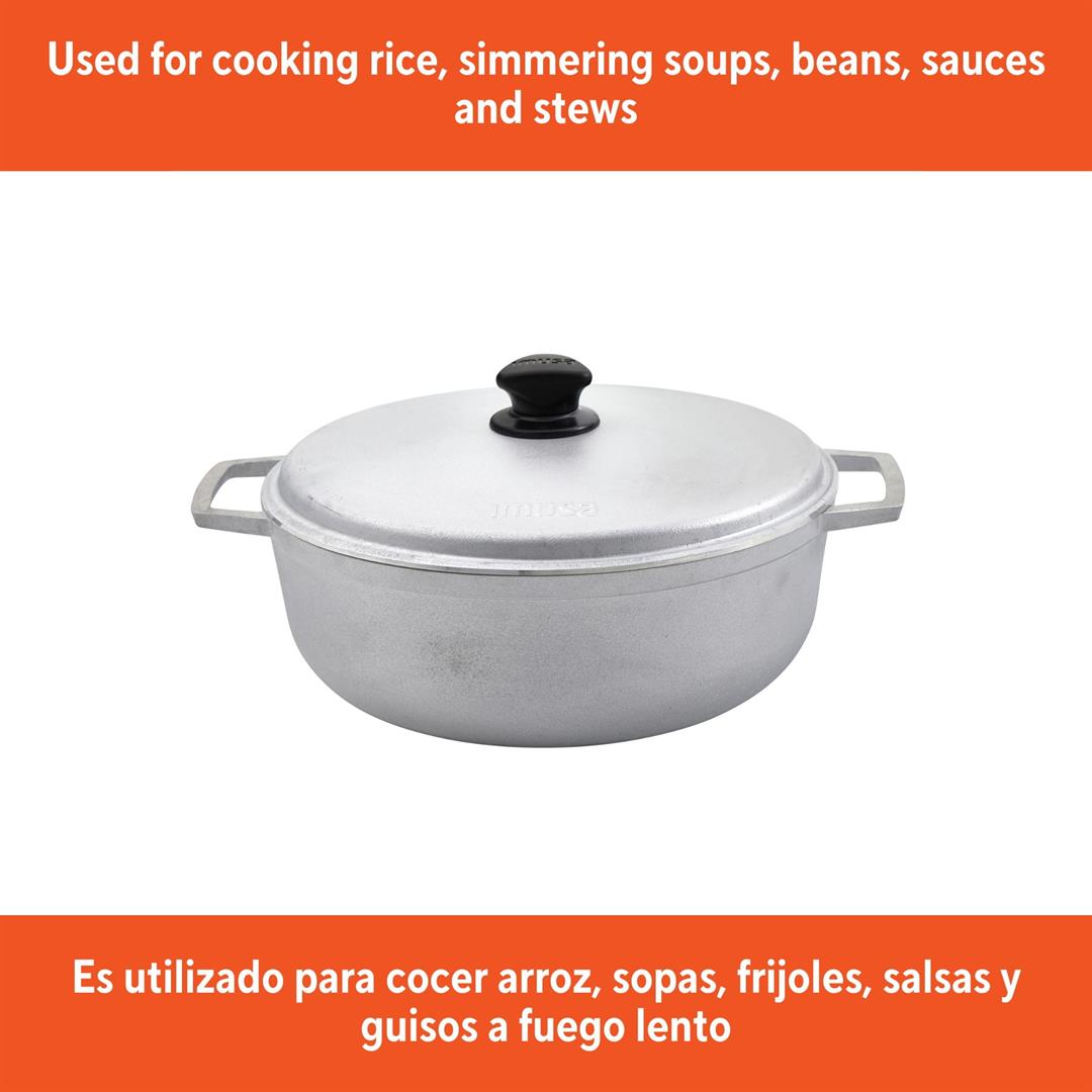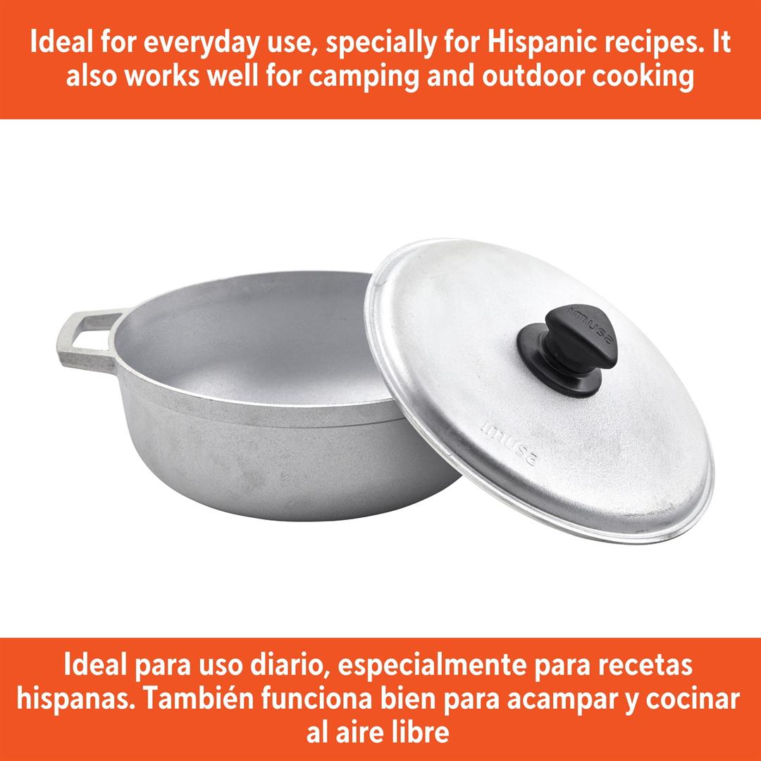 The IMUSA 4.8Qt Basic Caldero is an essential piece in every Hispanic kitchen, renowned for its durability and unique design. This caldero is manufactured in Colombia and is made of cast aluminum with a natural finish cooking surface that seasons over time. This IMUSA cookware piece has a capacity of 4.8Qt. The IMUSA Basic Caldero includes its tight-fitting lid, steam vent for moisture control, and a convenient knob and side handles for safe operation. The thick walls will deliver consistent and delicious results each time. With this versatile piece, you can cook a variety of different meals. Whether creating gourmet dishes, cooking rice, simmering beans, braising meats, preparing stews, crafting sauces, or enjoying comfort foods, the IMUSA Basic Caldero excels. The IMUSA Basic Caldero is oven-safe without the lid, making it perfect for grilling and baking. After cooking, take this caldero straight from the kitchen to the table as a stylish serving dish. Trust the IMUSA Basic Caldero for balanced, home-cooked meals. It will surely become your kitchen’s beloved companion, uniting tradition, and innovation in every delectable creation. Elevate your culinary experience with this enduring symbol of Hispanic heritage.