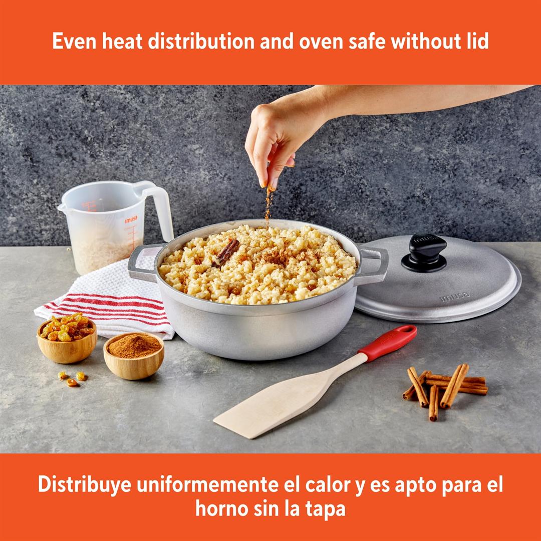 COOKING CAPACITY: This caldero has a capacity of 4,8 quarts, making it suitable for various meals and cooking needs with ease DURABLE AND RELIABLE: Made of cast aluminum for reliable durability, with a cooking surface that seasons over time for enhanced flavor TRADITIONAL AND CONVENIENT DESIGN: Provides even heat distribution and is oven safe without the lid, also features easy grip handles and a tight-fitting glass lid with a steam vent CULINARY ADAPTABILITY: Perfect for cooking rice, simmering soups, beans, sauces, stews, and a wide variety of other delicious dishes, this versatile caldero adapts to numerous cooking styles and recipes, making it an essential tool in any kitchen VERSATILE ESSENTIAL: Perfect for preparing a diverse array of traditional Hispanic recipes, making it an indispensable choice for everyday culinary endeavors