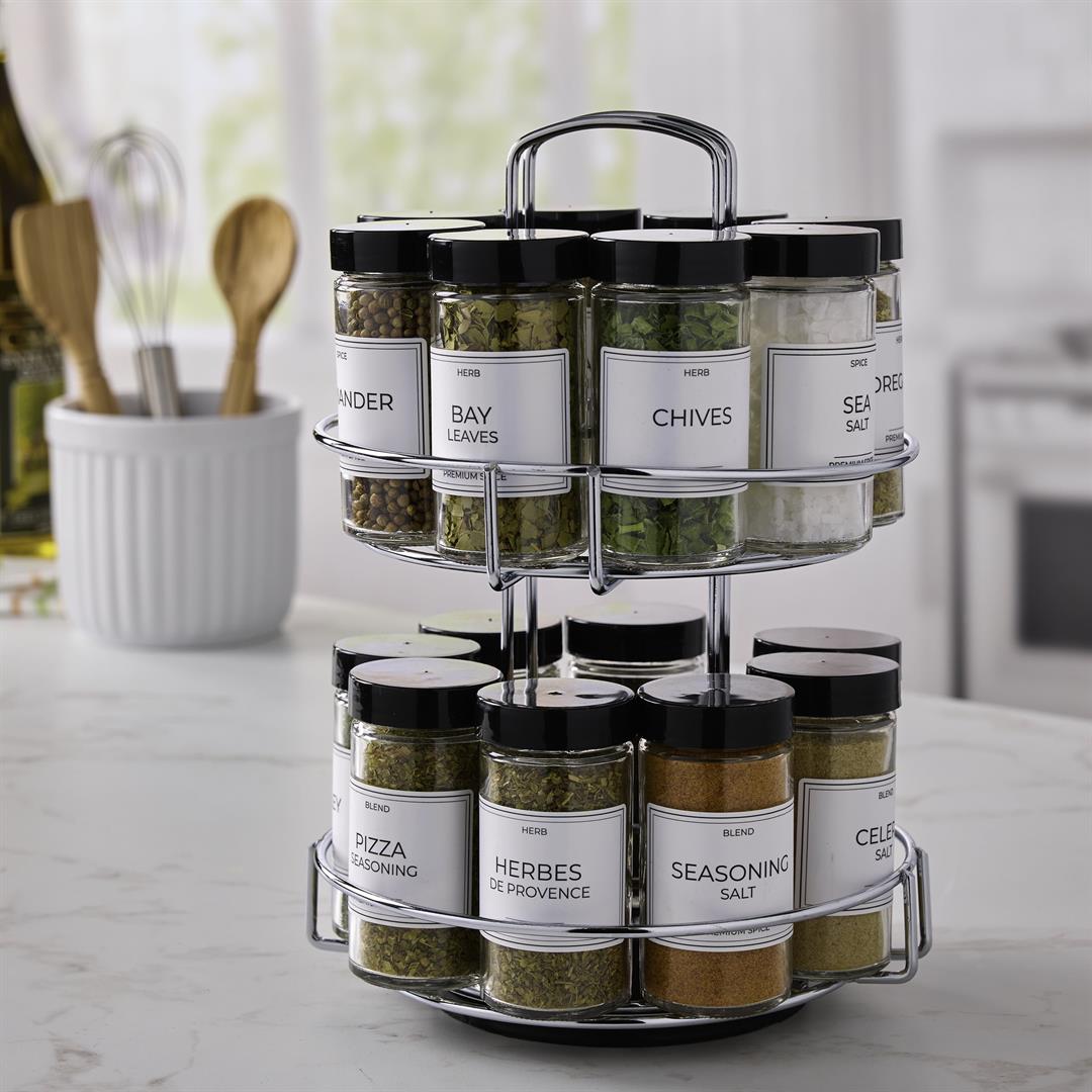The Kamenstein 16-Jar Revolving Spice Rack includes 16 spice jars with removable sifter discs, and 1 revolving chrome wire spice rack organizer that complements your kitchen decor. Spices include Basil, Bay Leaves, Celery Salt, Chives, Coriander, Crushed Mint, Fennel Seed, Herbes De Provence, Italian Seasoning, Marjoram, Oregano, Parsley, Pizza Seasoning, Rosemary, Sea Salt, and Seasoning Salt (spices may vary). The rotating design keeps spices neat and easily accessible on countertops or in cabinets. Each jar features an easy-to-read label identifying the spice and a removable sifter cap to easily sprinkle, scoop, or pour your desired amount. The built-in handle provides easy transport around your home.