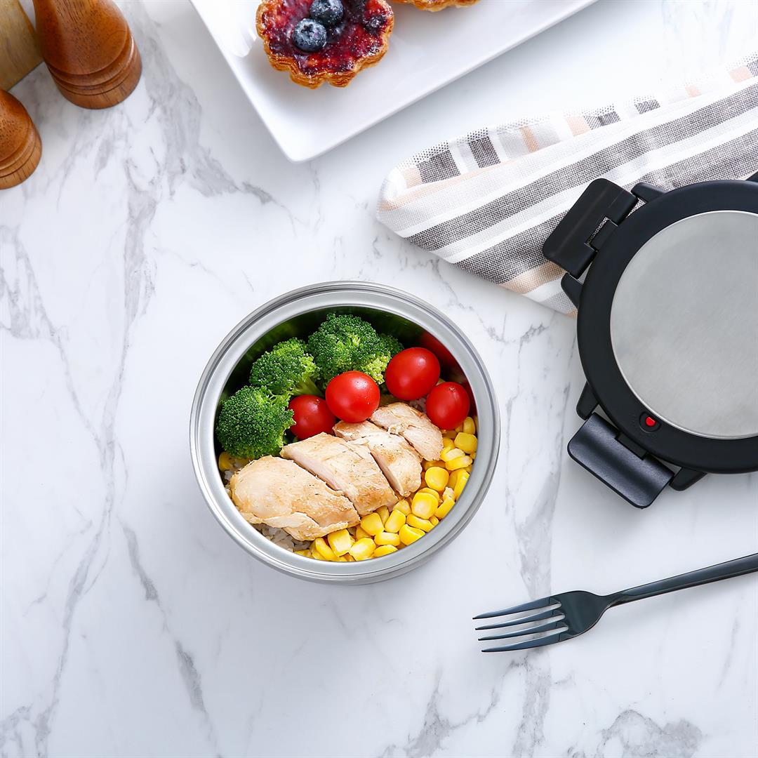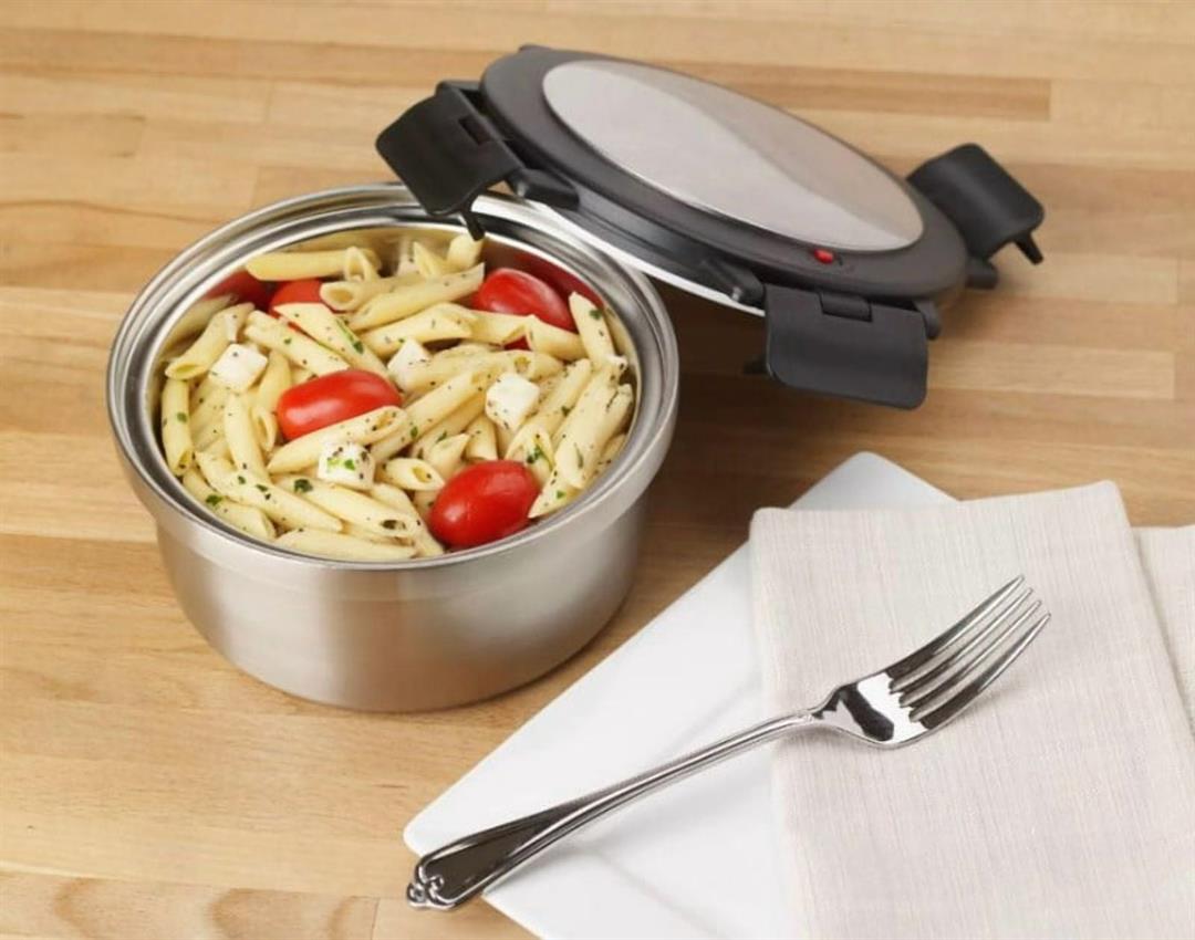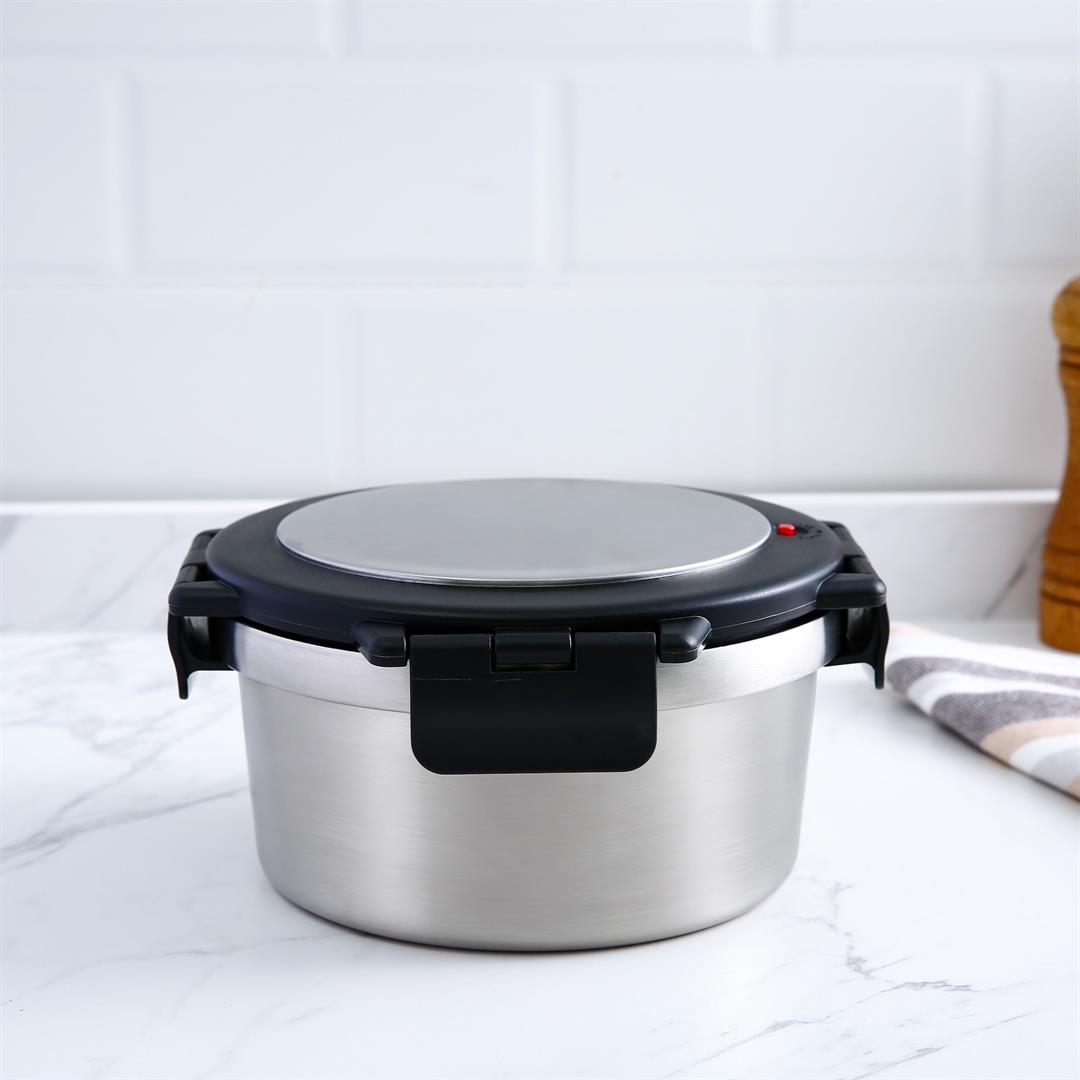 Double-walled construction that keeps hot food warm and cold food cool for hours Wide mouth is perfect for soups or salads Pressure valves secure your food and create a vacuum to help preserve the temperature of your food Hand wash only Measures 7″ x 7″ x 3.5″ Color: Silver & Black For maximum thermal efficiency: pre-heat or pre-chill the product just prior to use. Fill with hot or cold water, attach lid, let stand 5 to 10 minutes and empty water. After filling container with contents, re-cover with lid to increase thermal efficiency. Also, ensure all latches are secured. As the time span for keeping various food contents warm and cold will vary, keeping the container in an insulated lunch bag will improve performance. Keep meals perfectly portable with the Mainstays 28 oz round insulated food container. Made of food-safe stainless steel, this container features double-wall insulation to maintain warm or cold temperatures for hours. The locking lid creates an airtight seal to retain freshness and prevent leaks. Use it to carry soups, entrees, salads, dips, snacks and more to work, school, or outdoor excursions. The stainless steel material is durable and won’t retain food odors or flavors. For grab-and-go convenience, this insulated container makes transporting perishable foods easy and safe.