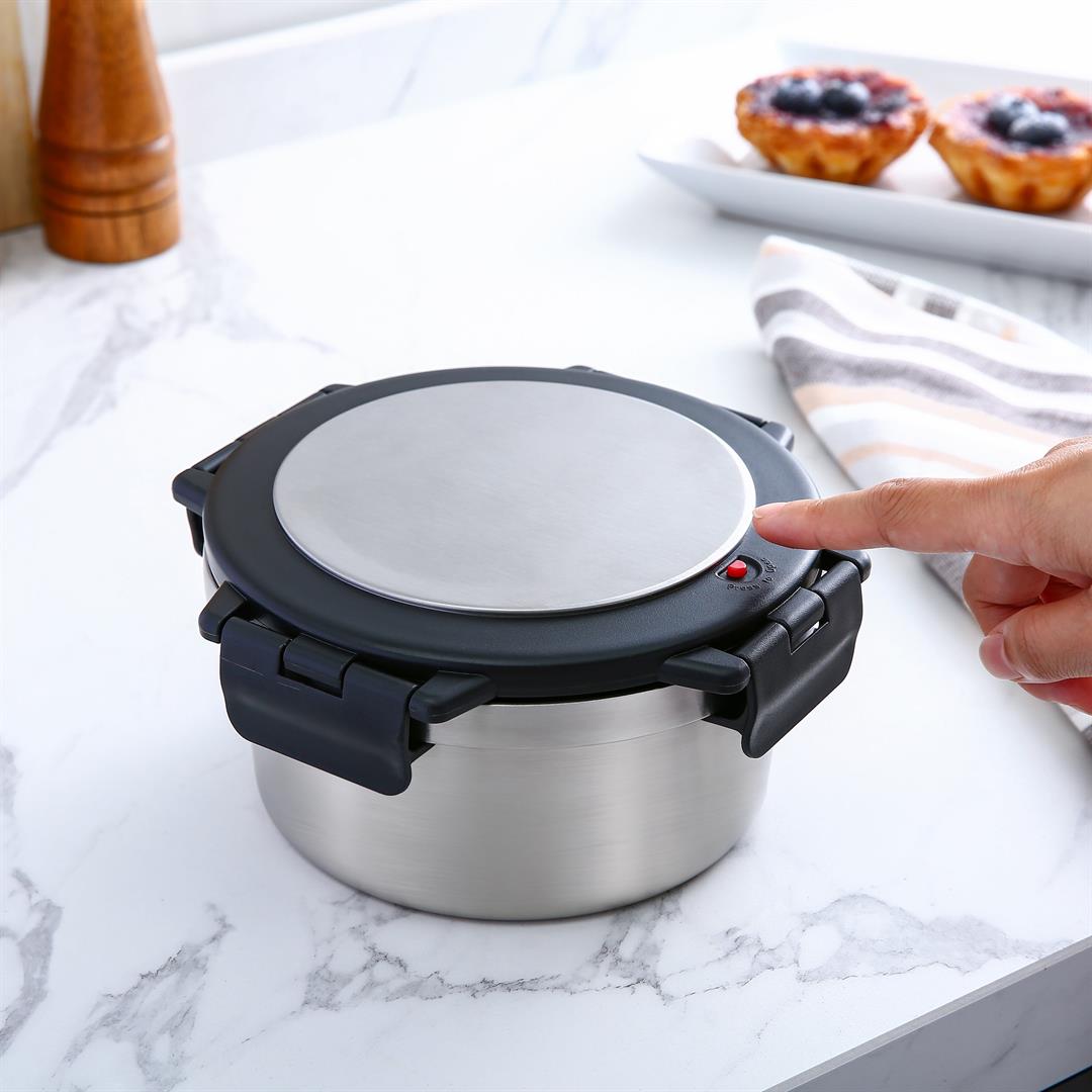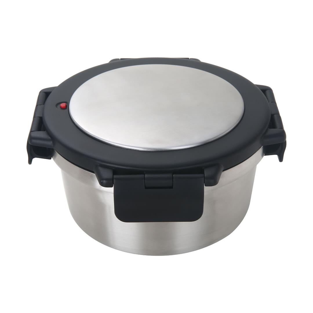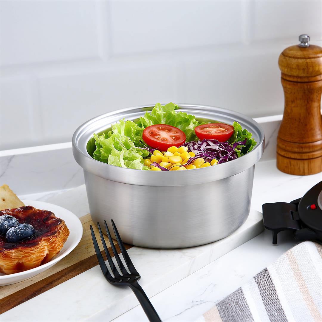 Double-walled construction that keeps hot food warm and cold food cool for hours Wide mouth is perfect for soups or salads Pressure valves secure your food and create a vacuum to help preserve the temperature of your food Hand wash only Measures 7″ x 7″ x 3.5″ Color: Silver & Black For maximum thermal efficiency: pre-heat or pre-chill the product just prior to use. Fill with hot or cold water, attach lid, let stand 5 to 10 minutes and empty water. After filling container with contents, re-cover with lid to increase thermal efficiency. Also, ensure all latches are secured. As the time span for keeping various food contents warm and cold will vary, keeping the container in an insulated lunch bag will improve performance. Keep meals perfectly portable with the Mainstays 28 oz round insulated food container. Made of food-safe stainless steel, this container features double-wall insulation to maintain warm or cold temperatures for hours. The locking lid creates an airtight seal to retain freshness and prevent leaks. Use it to carry soups, entrees, salads, dips, snacks and more to work, school, or outdoor excursions. The stainless steel material is durable and won’t retain food odors or flavors. For grab-and-go convenience, this insulated container makes transporting perishable foods easy and safe.