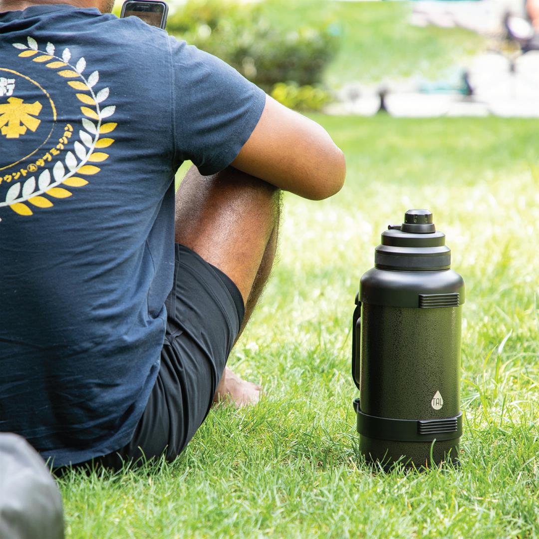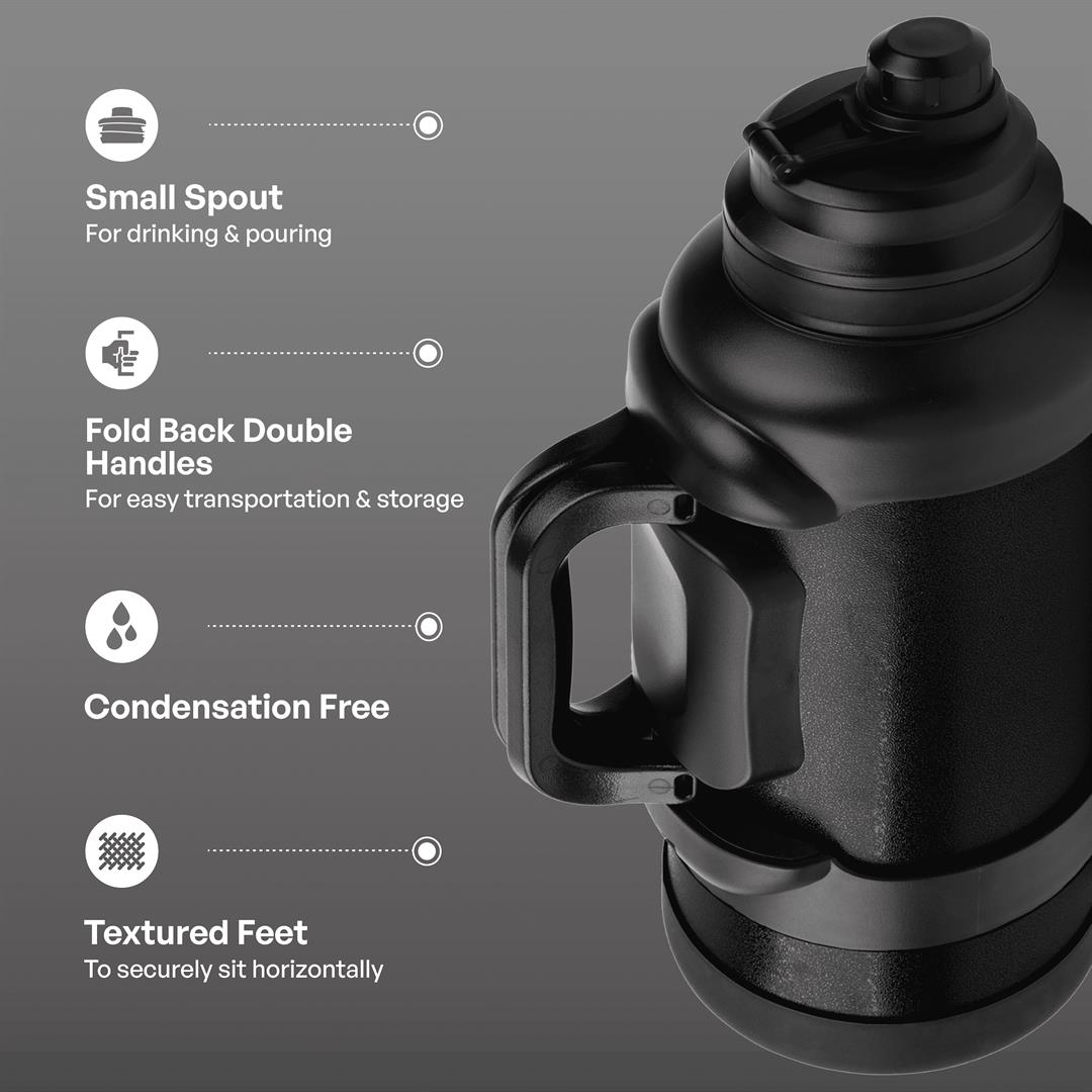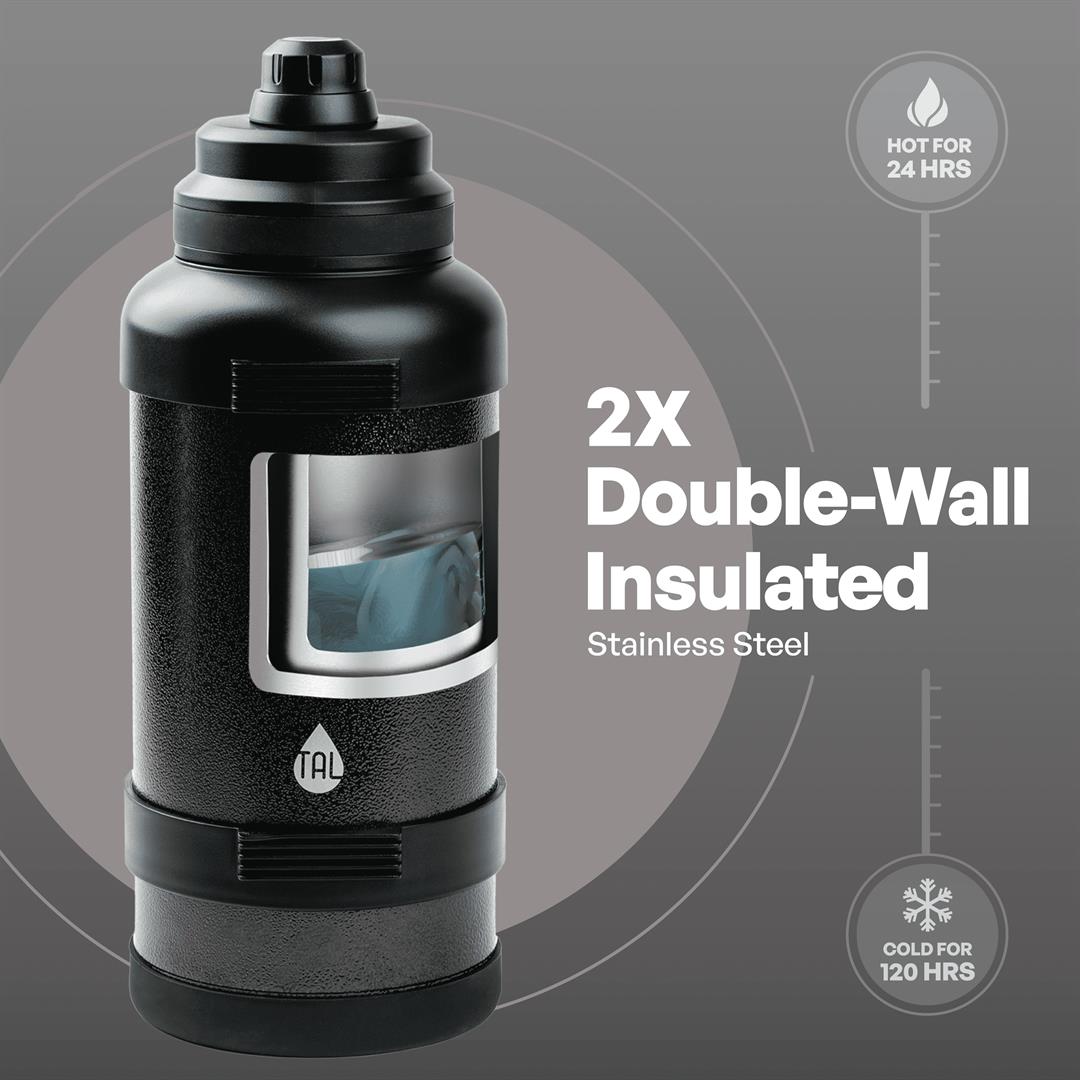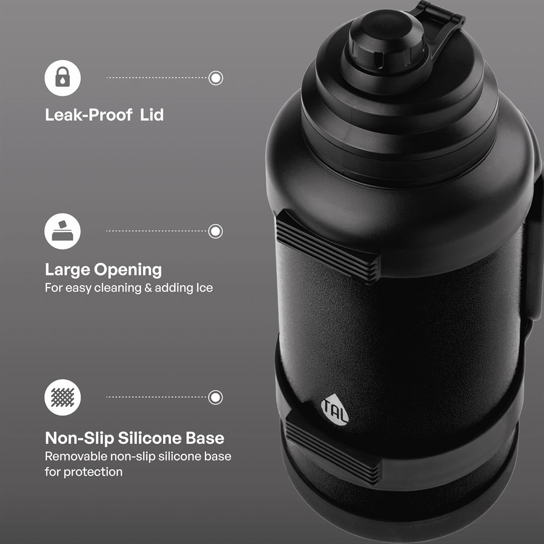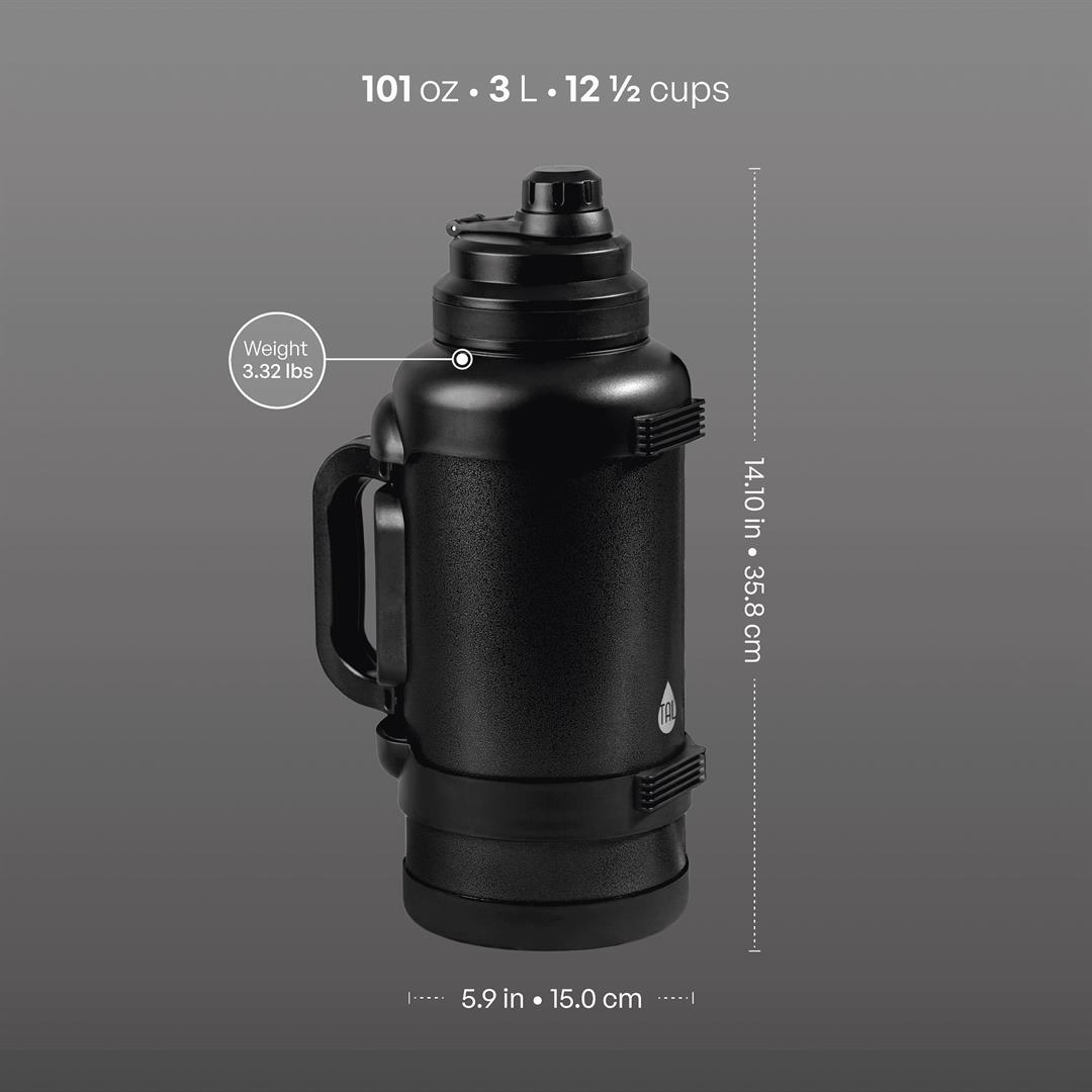 TAL Stainless Steel Zeus Water Bottle 3 Liter, Black,1 each Double Wall Insulated: Keeps your drinks hot or cold for hours. Leak-Proof Lid: Equipped with a secure, leak-proof lid to prevent spills and ensure your beverage stays safely contained during transport. Convenient Handle: Features a sturdy handle for easy and comfortable carrying wherever you go. Large Opening: A wide opening for easy filling, pouring, and cleaning. Non-Slip Base: The non-slip base ensures stability and protection.