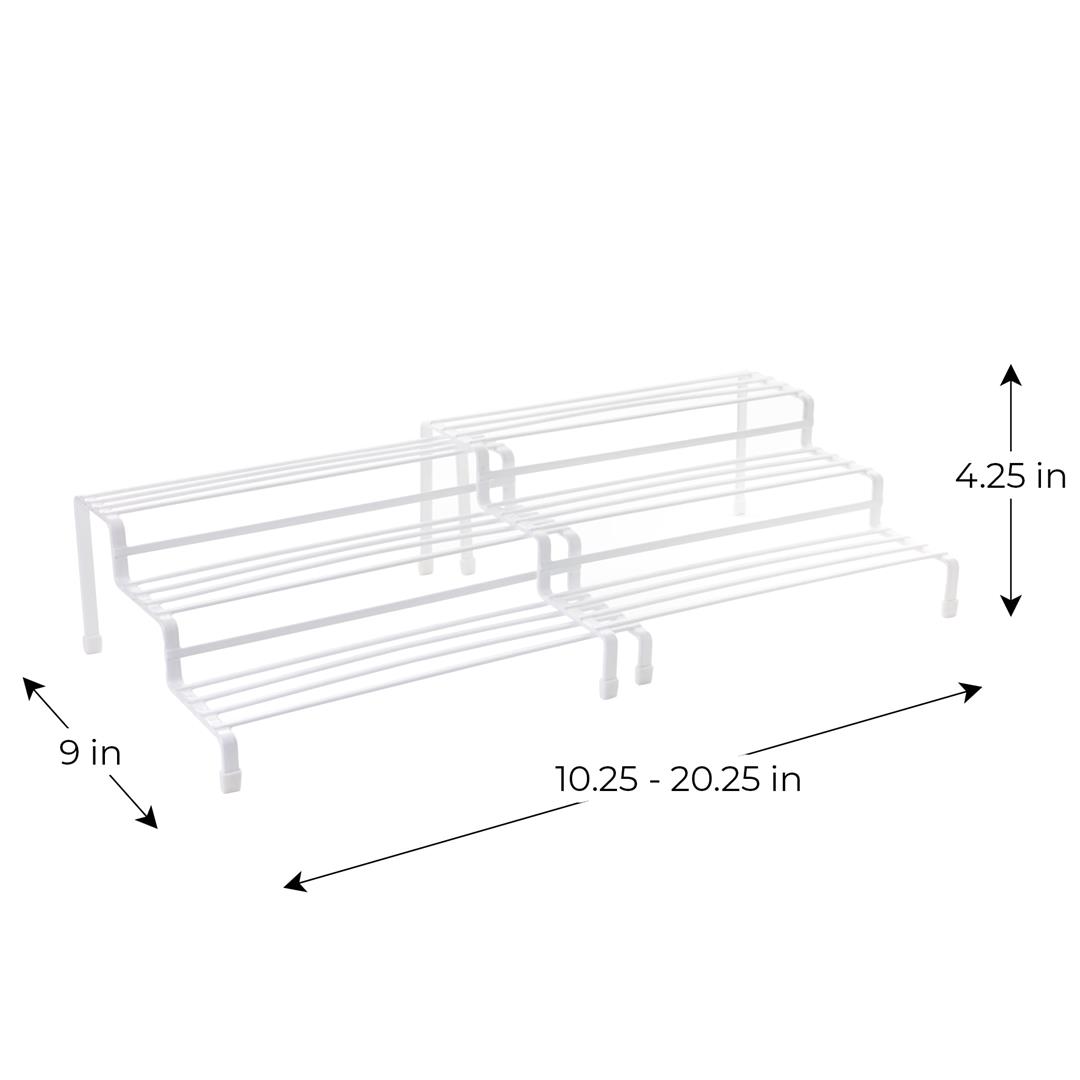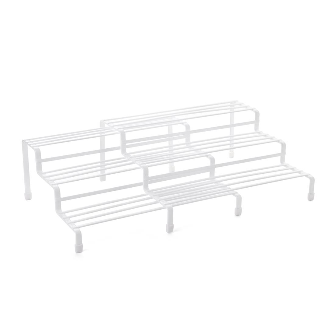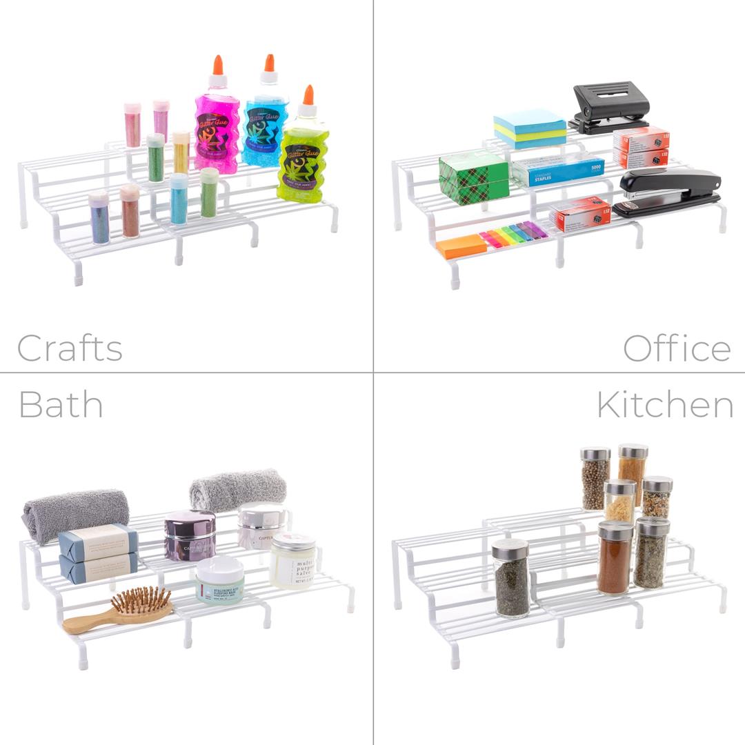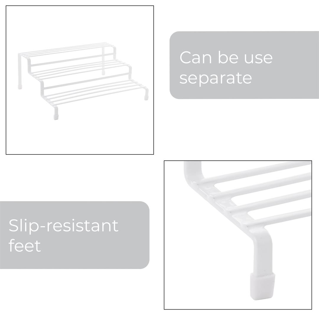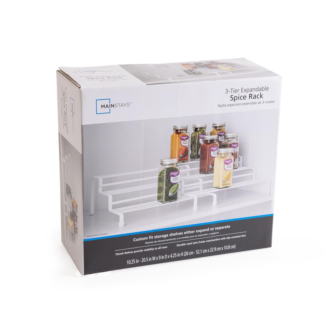 Mainstays 3-Tier expandable Spice Rack in white wire. Easily create a custom fit spice rack for your kitchen. Conveniently tiered shelves enable visibility on all levels. Durable steel construction will ensure for a long time and the non-slip feet will prevent your spice rack from movement. Easy to clean rust resistant finish, just wipe with a damp cloth. Also, great to organize craft paints and supplies, medicine, or anything else that needs a perfect spot!