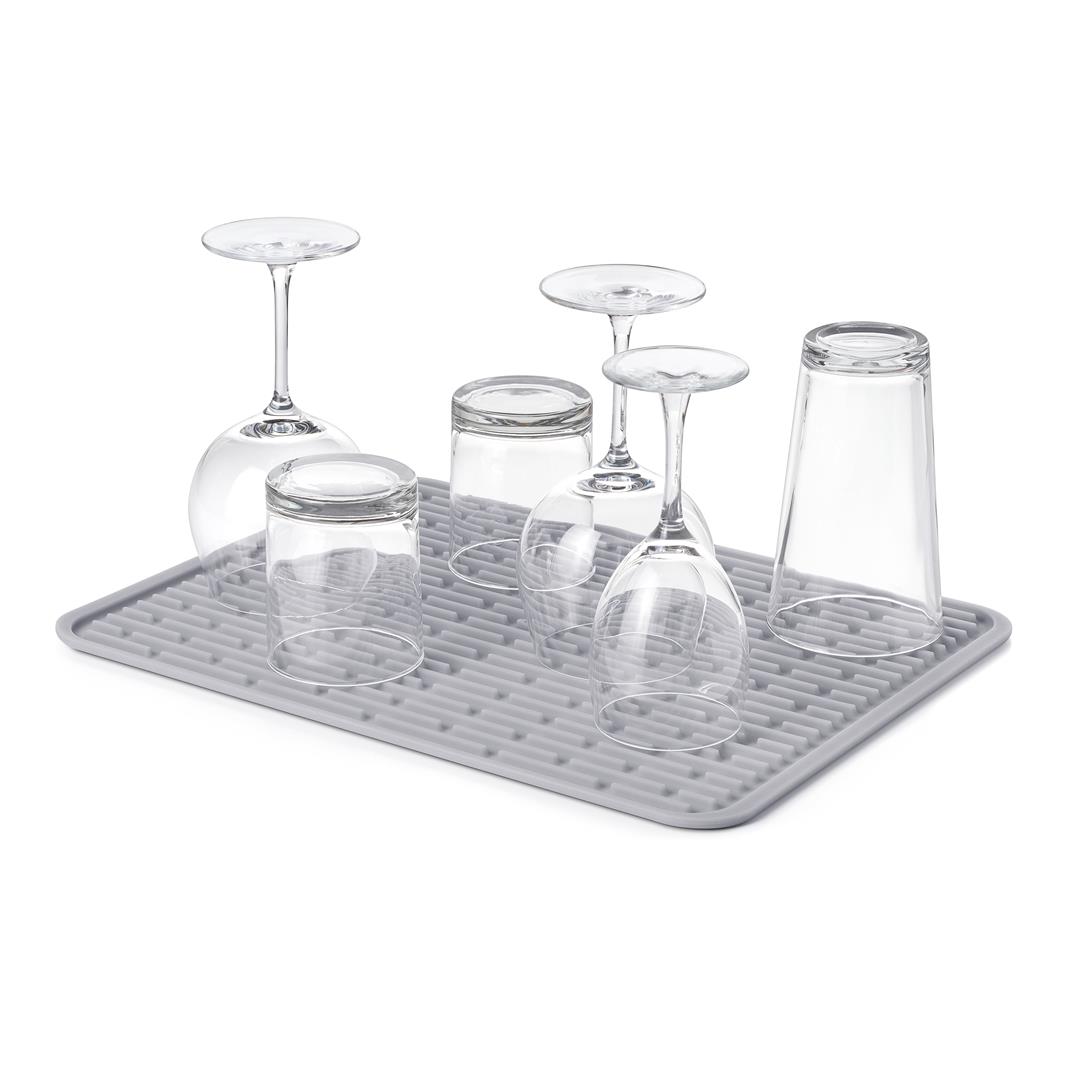 Sized to fit large items such as 12 frying pans, platters, salad bowls and more Unique ribbed design helps dry items by maximizing drainage and aeration Soft, non-slip surface protects delicate items like stemware and is easy-to-clean Flexible silicone Mat can be rolled up or hung for storage Made of food-safe silicone Product Dimensions 16.875 in x 12.5 in x 0.25 in