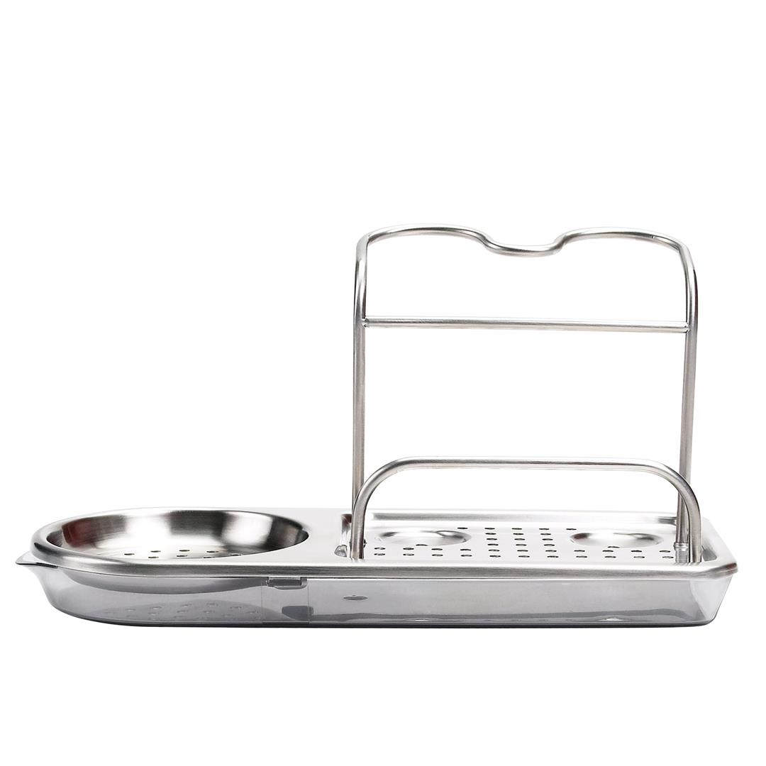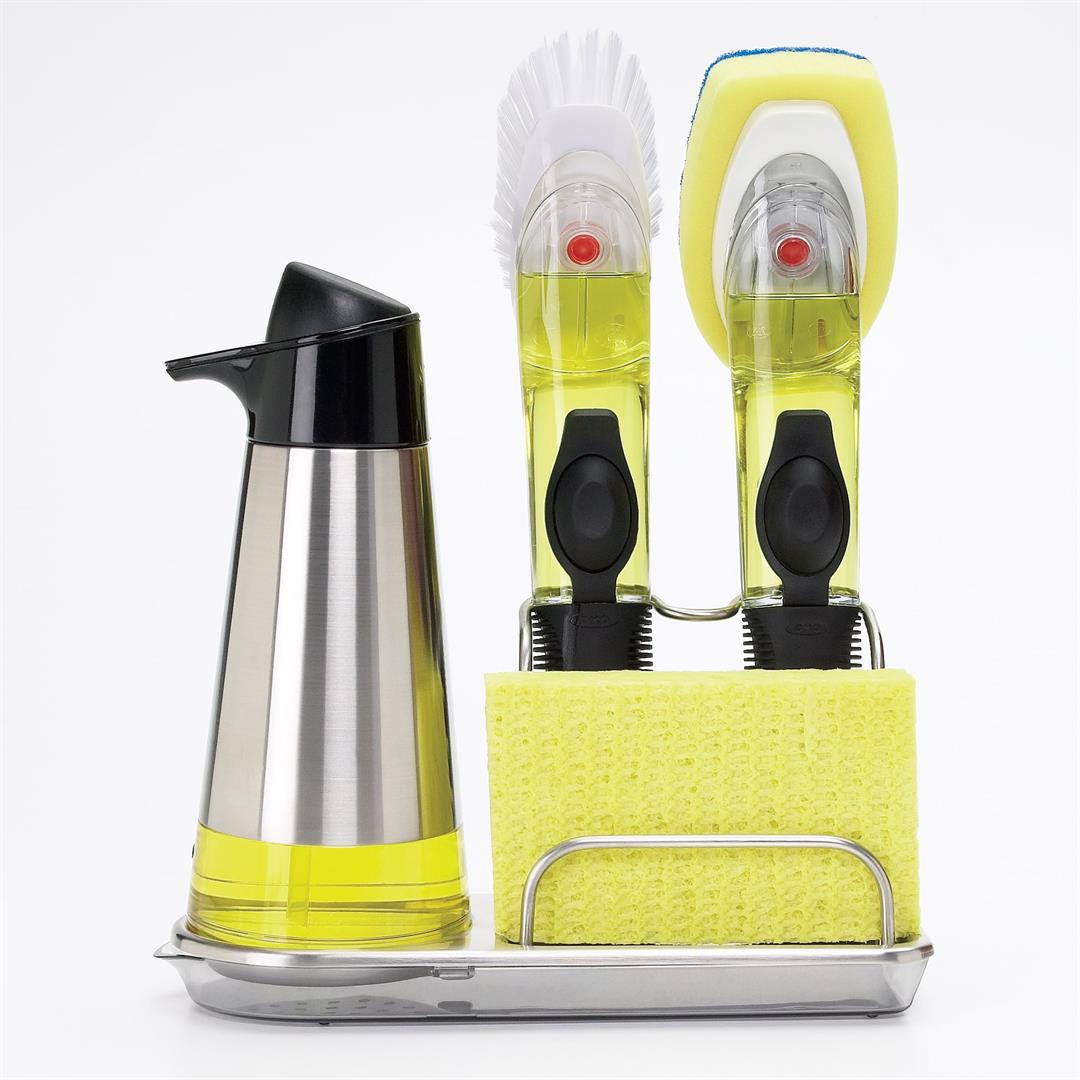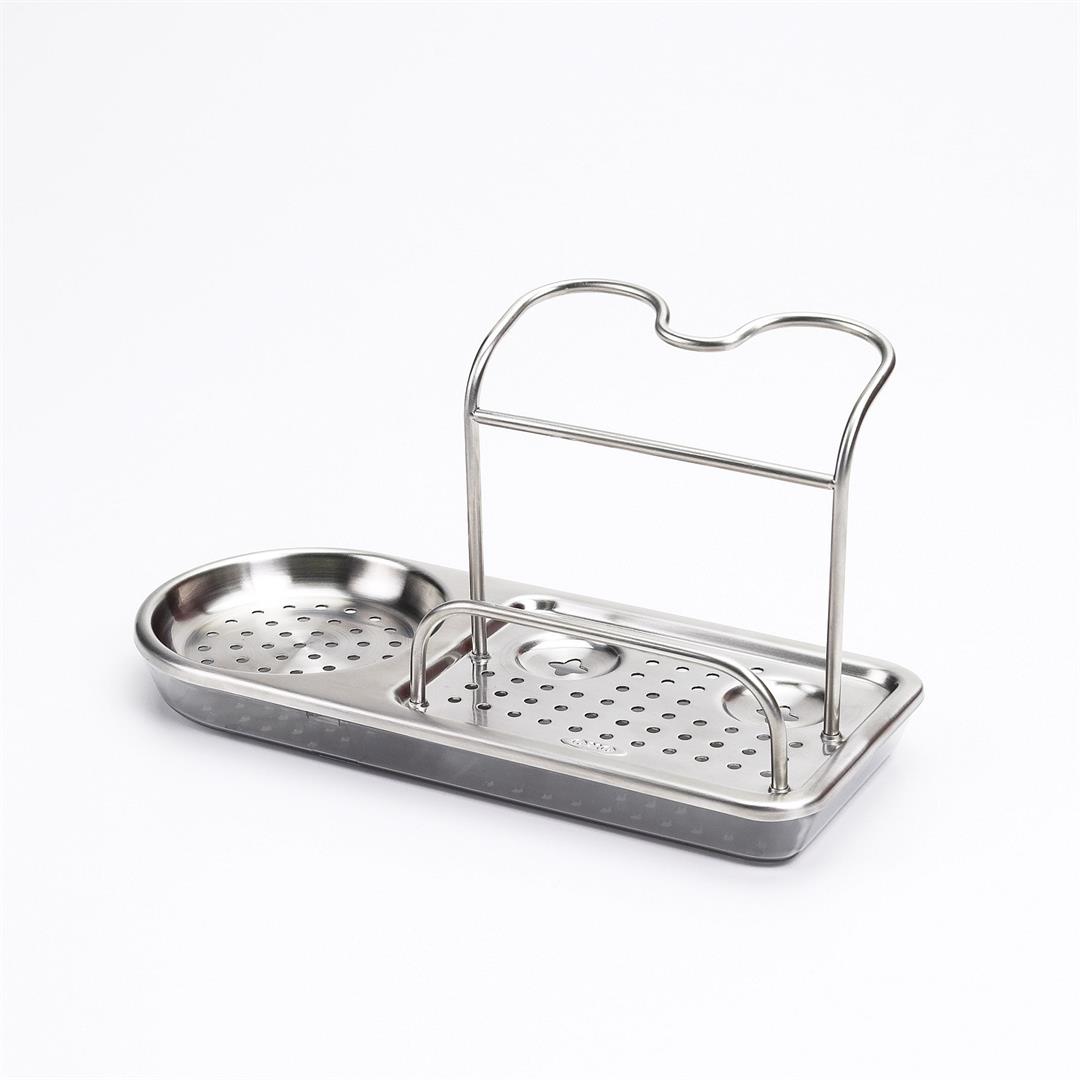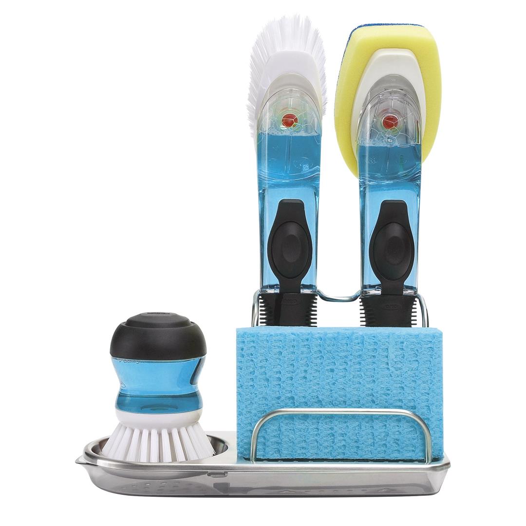 OXO Softworks Stainless Steel Sink Organizer Separate areas for palm brushes, pump dispensers, sponges & more Long handled tools store upright for easy access Perforated base keeps sponges and tools dry Removable drip tray