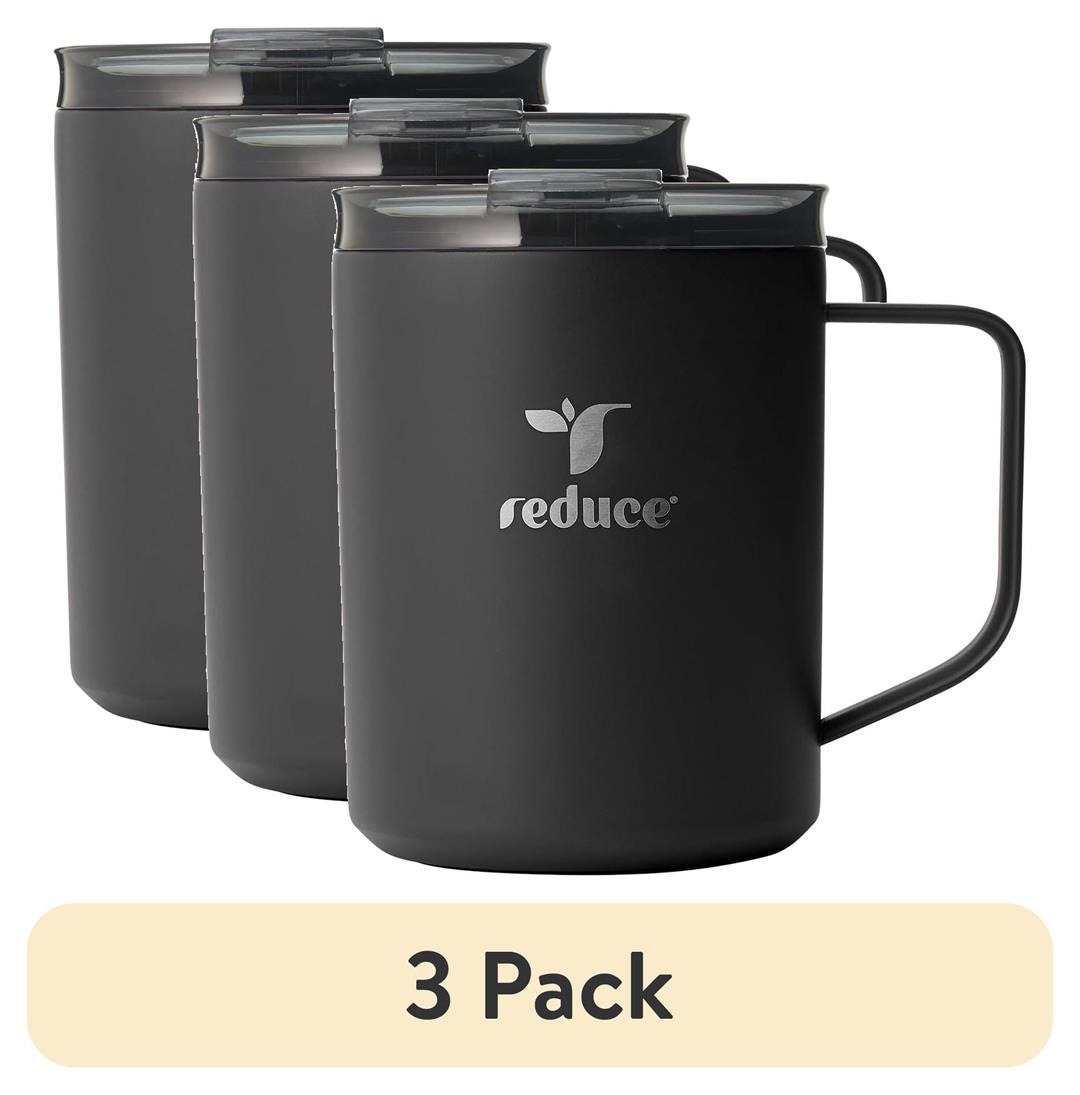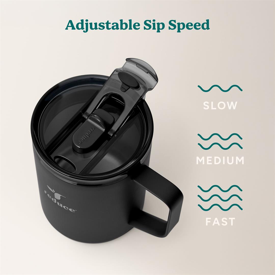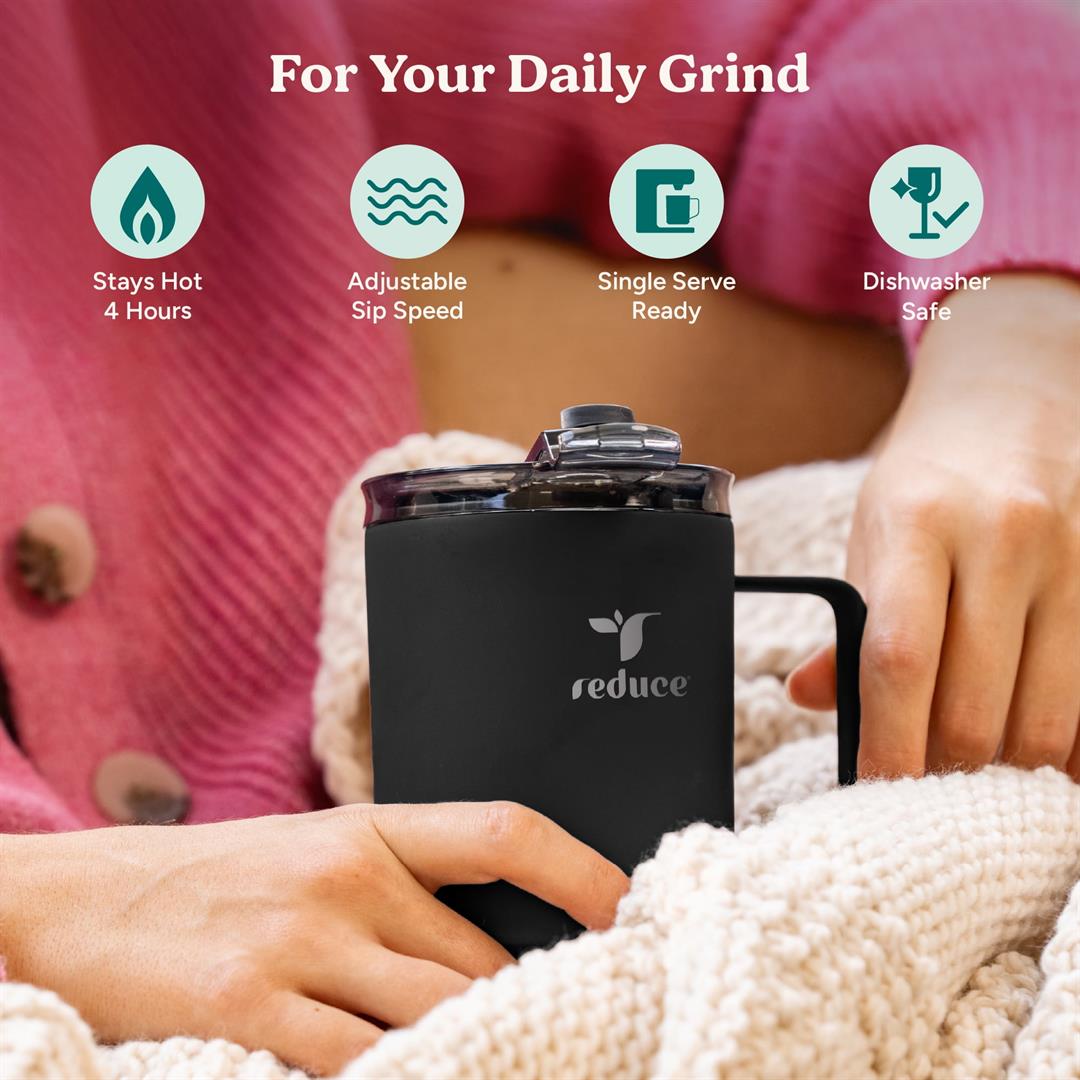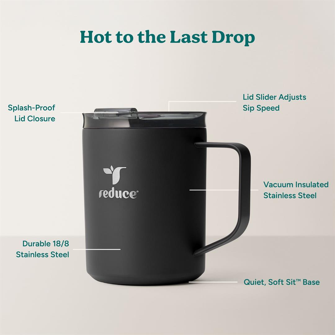 Reduce Vacuum Insulated Stainless Steel Hot1 Mug with Lid and Handle, Black, 14 oz. Includes 1 Hot1 Mug with Sip-It-Your-Way Lid 14 oz capacity with temperature adjusting lid vent Keeps drinks hot for up to 4 hours Dual-Wall vacuum insulated Soft Sit(TM) silicone base Easy to clean, dishwasher safe 18/8 Food-Grade Stainless Steel & BPA Free