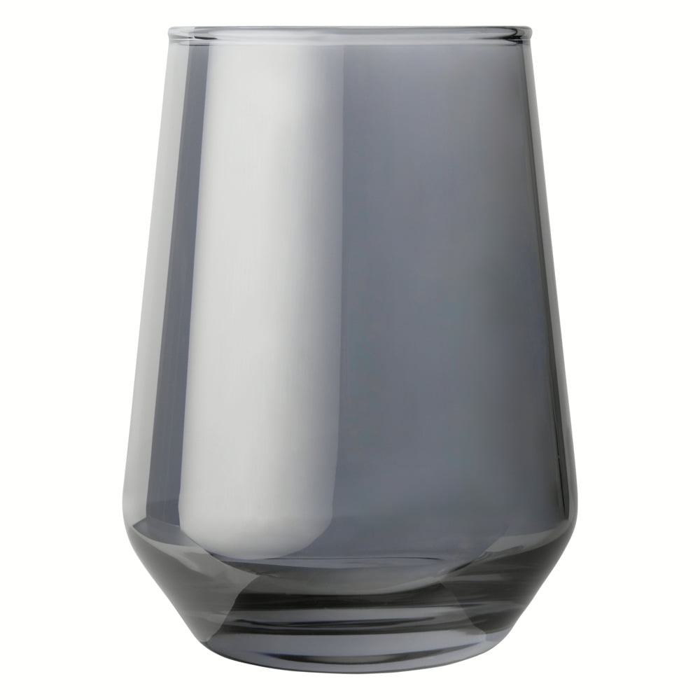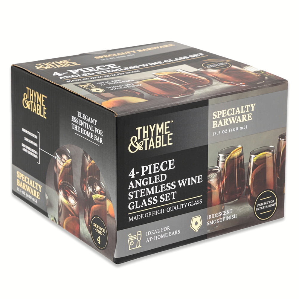 Thyme & Table 13.5 fl oz Smoke Angled Stemless Wine Glasses, Set of 4 13.5 fl oz capacity: The perfect size for your favorite beverages. Angled Stemless Design: A contemporary shape that adds a modern twist to your drinkware while ensuring stability and comfort. Smoke Iridescent Finish: The beautiful, shifting iridescent color adds a luxurious, sophisticated touch to your beverages. Versatile Use: Ideal for wine, cocktails, or any drink you wish to serve with a touch of style. Durable Glass Construction: Made from high-quality glass for lasting beauty and durability. Elegant & Functional: Combines sleek design with practical usability for both casual and formal occasions. Hand wash recommended to help preserve color and lasting quality.