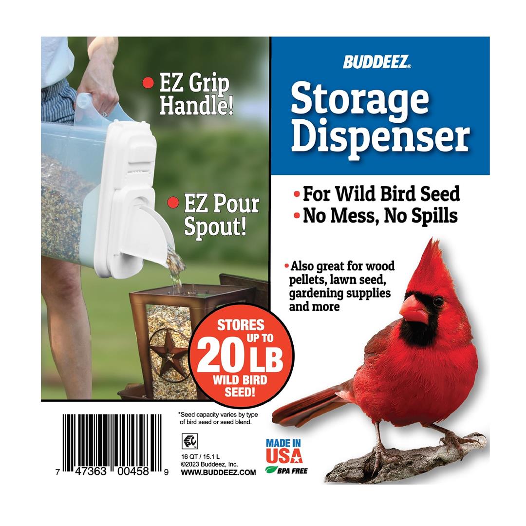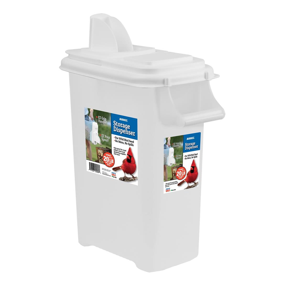 The Buddeez bird food storage dispenser is the perfect storage solution for wild bird seed. The dispenser features a built in spout that allows neat and easy refills for all of your bird feeders. The lid also has an extra-wide flip top opening if you prefer to use a scoop. The stackable dispenser has a narrow shape to help maximize your storage space. The strong, ergonomically designed hand grips make it a breeze to lift and handle large bags of seed. Other great uses for this heavy duty storage dispenser include wood smoker pellets, lawn seed, gardening supplies and ice melt.