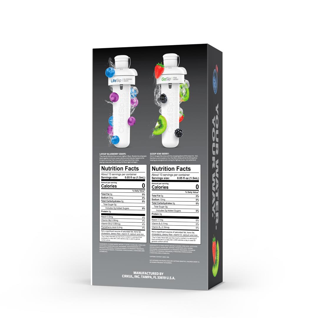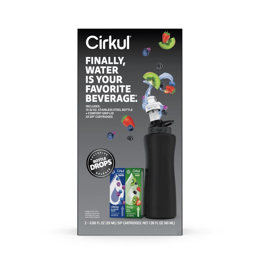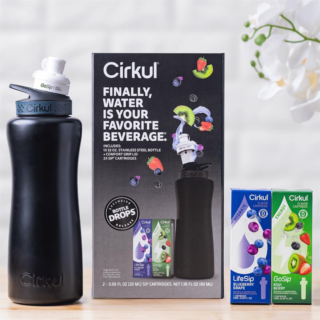 This Starter Kit is a new and exciting way to get started with Cirkul. The larger bottle allows for less refilling and more hydrating! Each kit includes one exclusive 32oz Matte Black Stainless Steel Water Bottle, a Matte Black Comfort Grip Wide Mouth Lid, and 2 flavor cartridges that are great for adding refreshing flavors to your water. Cirkul flavor cartridges have zero sugar, zero calories, and no artificial flavors or colors. We understand that drinking enough water can be challenging. At Cirkul, our mission is to make drinking water delicious, convenient, and fun.