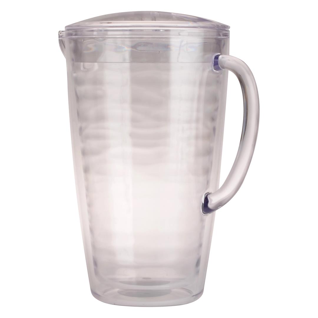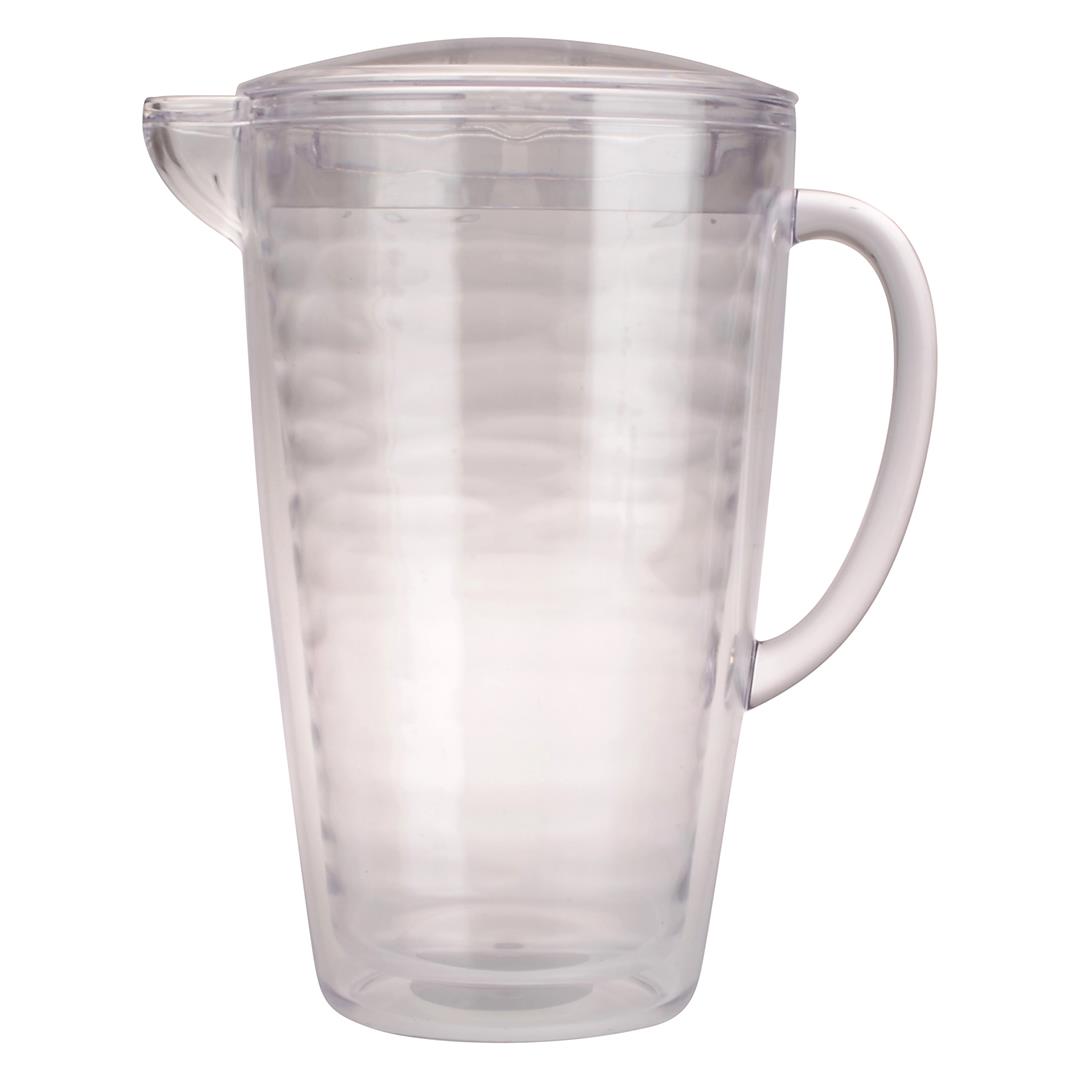 Mainstays 2.5-Quart Double Wall Clear Pitcher: Double-wall insulation keeps drinks cold longer Helps prevent condensation from damaging surfaces Not intended for use in microwave The product is dishwasher safe Material: 100% acrylonitrile-styrene plastic.