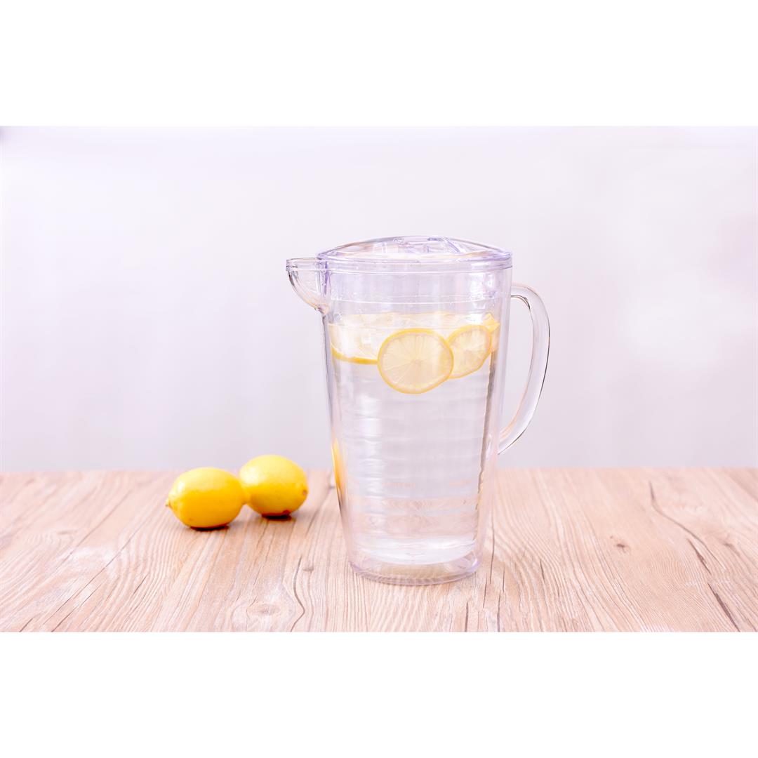 Keep your drinks colder for longer periods of time with the Mainstays 2.5-Quart Double Wall Acrylic Pitcher. The double-wall insulation prevents condensation, so your tabletops and coffee tables won’t experience premature wear. This large double-wall insulated pitcher features a 2.5-quart capacity, easy pour spout, sturdy handle, and a secure tight-fitting lid to prevent spills. The Mainstays pitcher is ideal for serving iced tea, flavored water, or any of your favorite beverages. This pitcher is the perfect addition to any kitchen and patio. Made with durable plastic, this long-lasting pitcher is dishwasher safe. Perfect for barbecues, pool parties, patios, and any other social event where beverages are served.