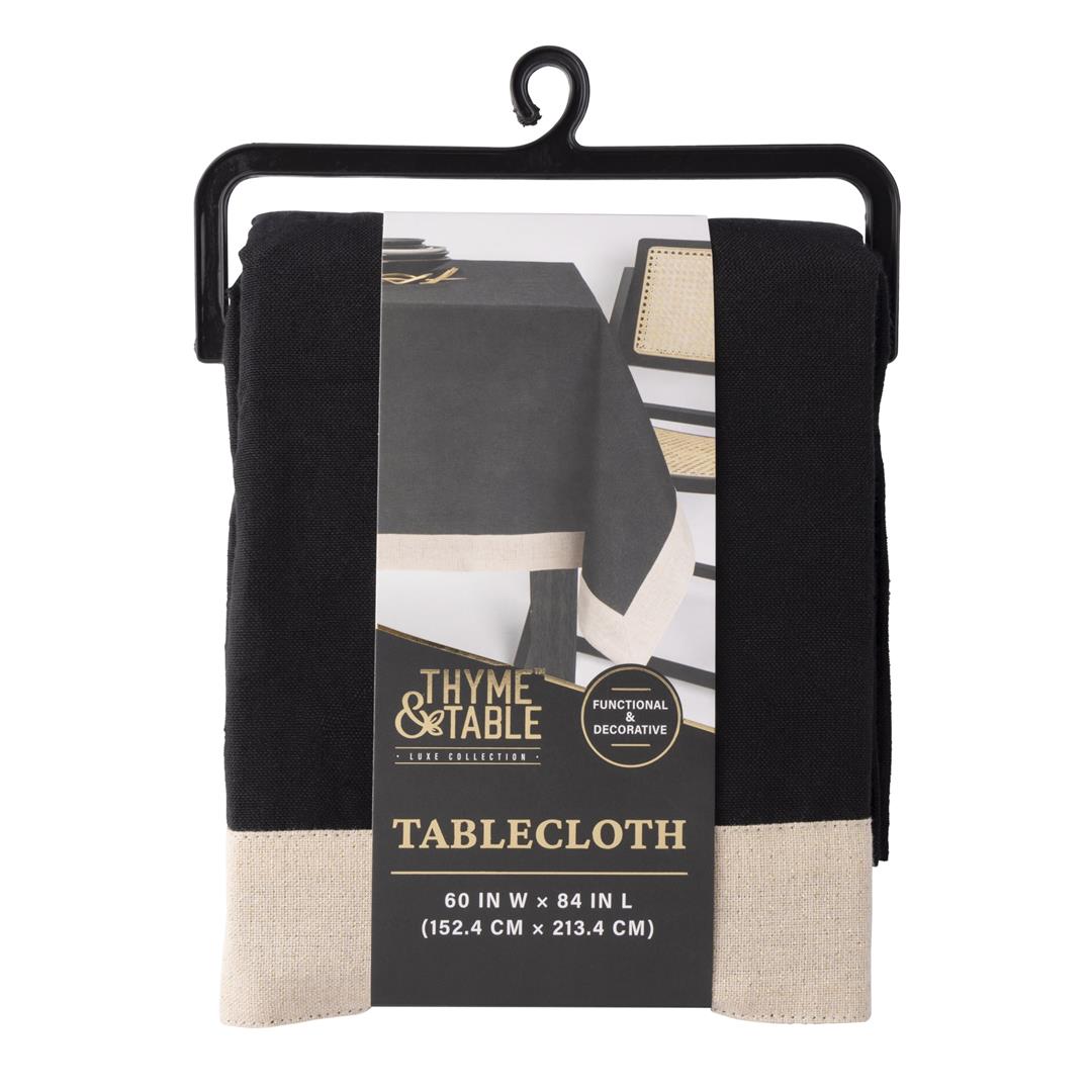 Thyme & Table 84″ Tablecloth, Black with Gold Border Seats 8-10 people: Perfect for family meals or dinner parties. Size: 60″ W x 84″ L, ideal for rectangular tables. Protects your table: Shields your table from spills, stains, and scratches, ensuring long-lasting use. Enhances your decor: The elegant gold leaf pattern adds a touch of luxury and sophistication to any dining setting. Stylish design: Black with a gold border for a sophisticated look. Thyme & Table 84″ Rectangle Tablecloth, Black with Gold Border